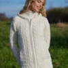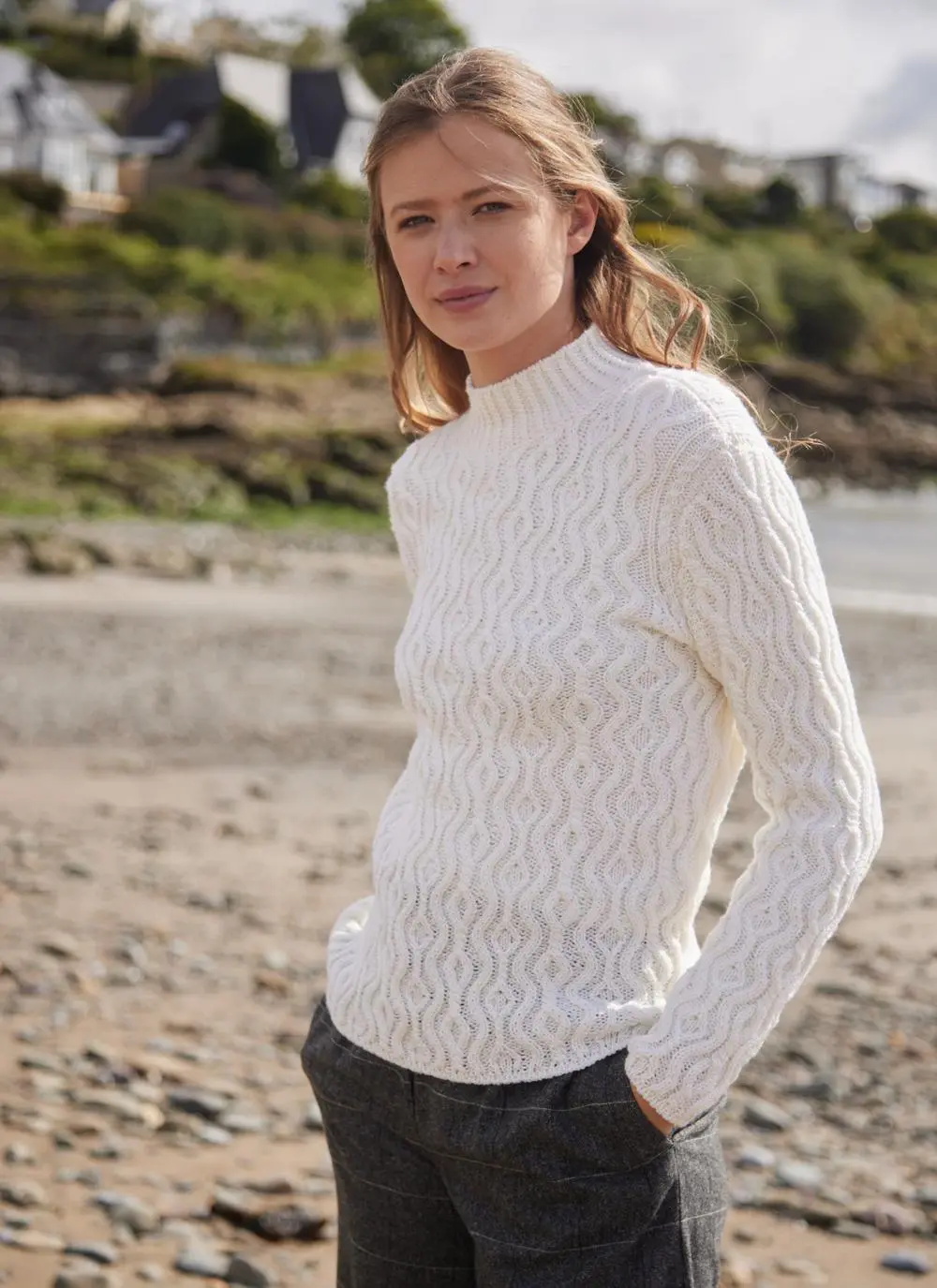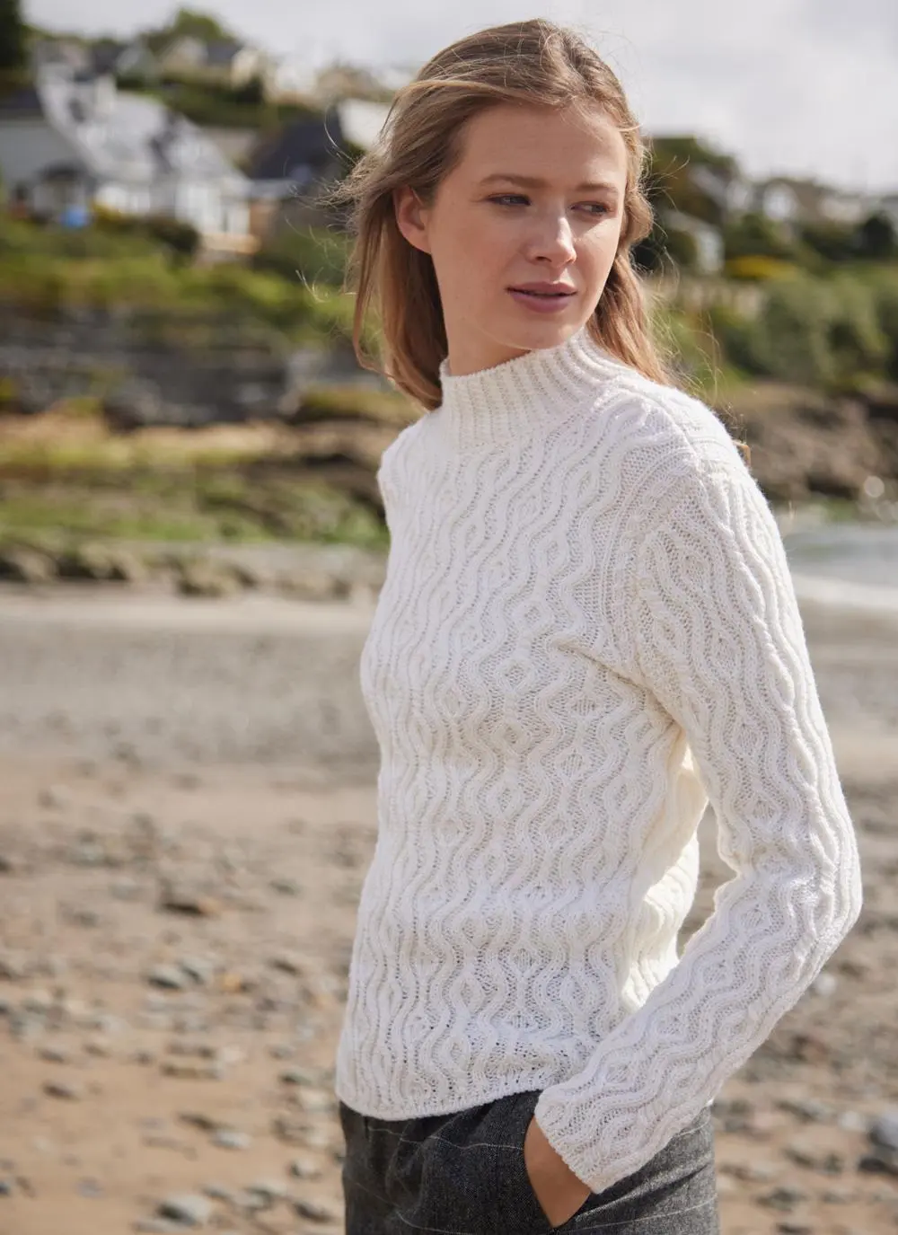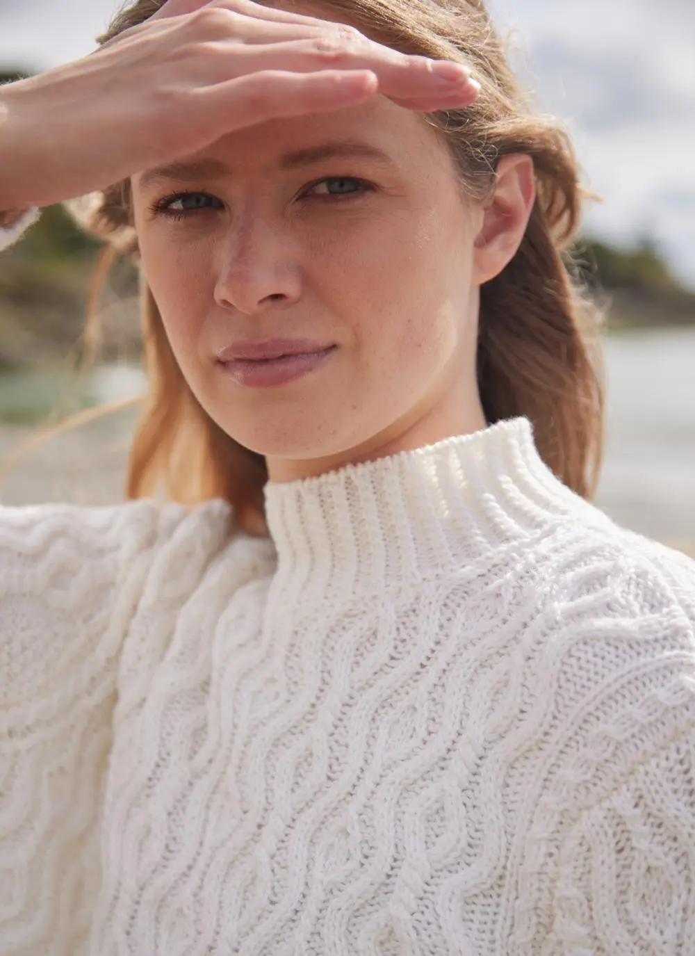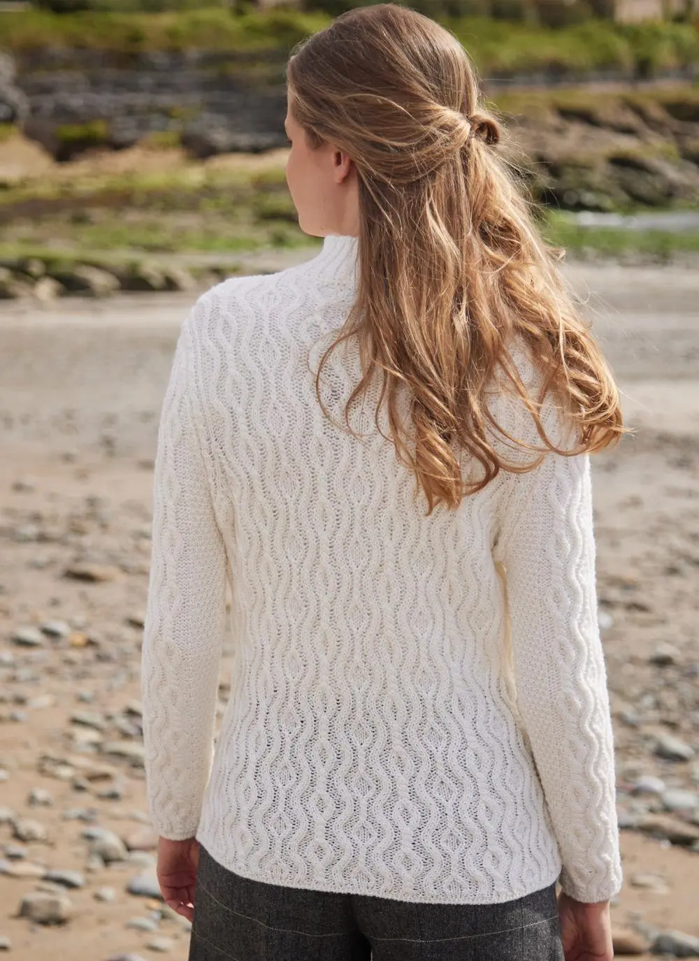 Exclusive to Blarney, our Laoise Aran Sweater is knit with supersoft merino wool, which is ideal for close-to-skin wear thanks to its heat regulating properties. This flattering sweater features an all-over zig-zag pattern and ribbed turtle neck. A classic yet contemporary addition to our knitwear collection.ibbed turtle neck. A classic yet contemporary addition to your knitwear collection!