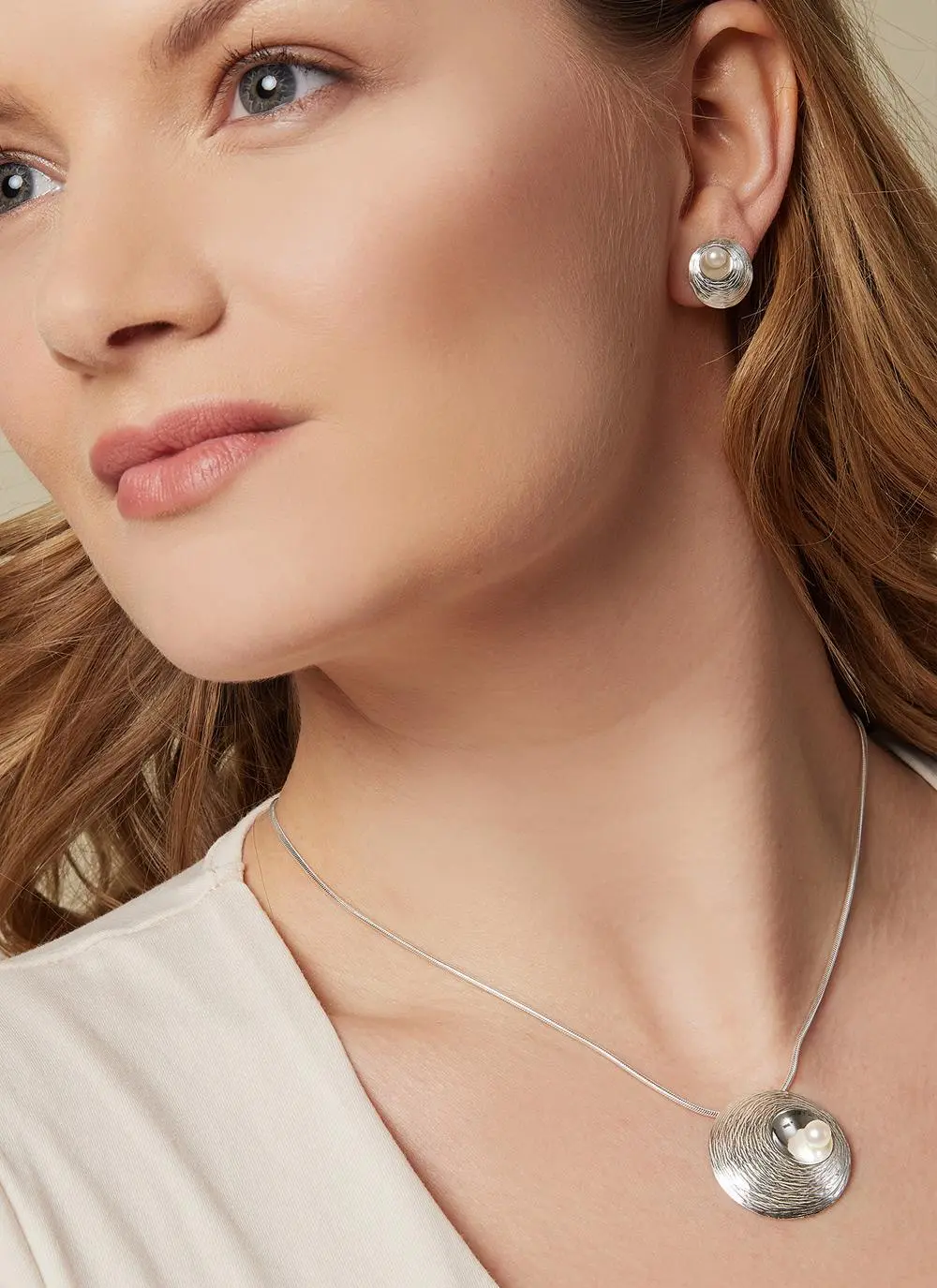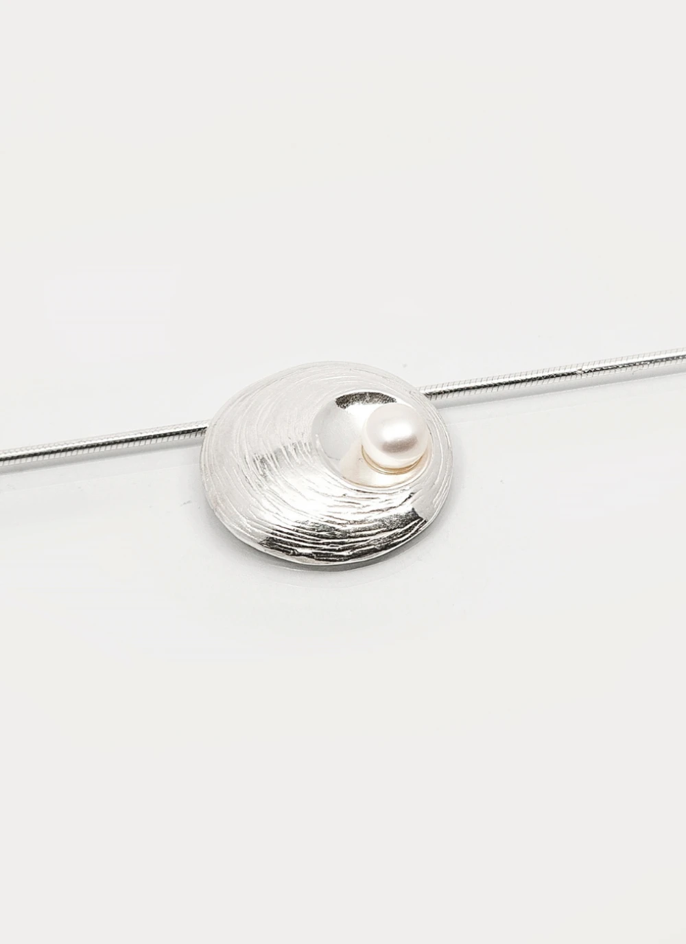 Classic meets contemporary with this stunning oyster pearl necklace by Irish jewelry designer Martina Hamilton. From a slinky snake chain hangs a 3cm pendant. A classic, cultured pearl is set in a textured dome of sterling silver with a mirrored, light-reflecting finish. Handcrafted in Ireland.