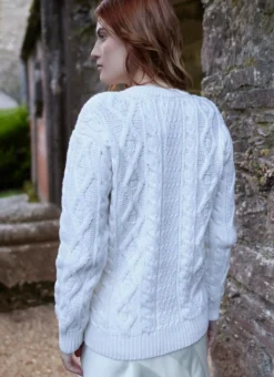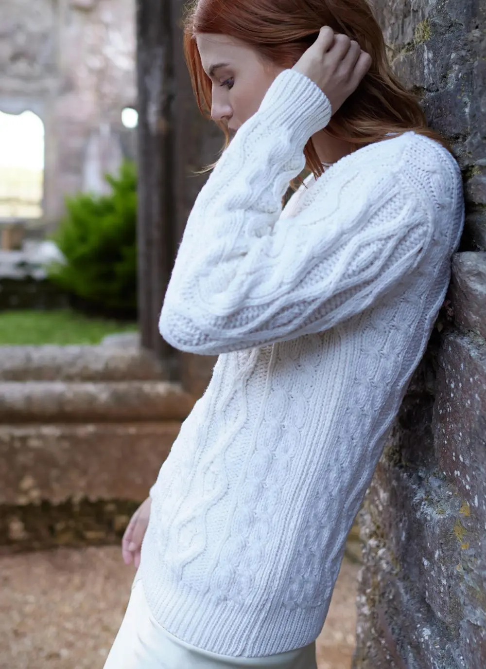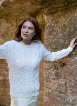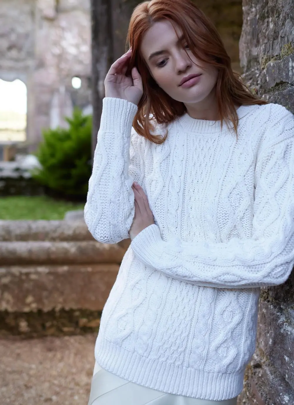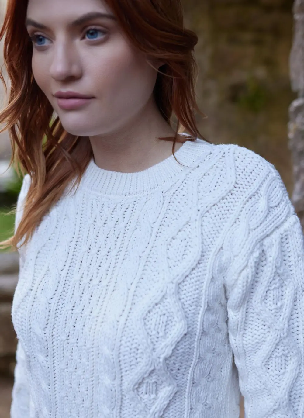 A beautiful sweater for today, whose history spans centuries of tradition. Our classic Lily Aran Crew is knit with a stunning array of cable and diamond Aran stitches, trimmed with rib-knit cuffs and neckline. Knit with 100% sustainable merino wool, which is celebrated for its exceptionally fine and soft fibers.Â