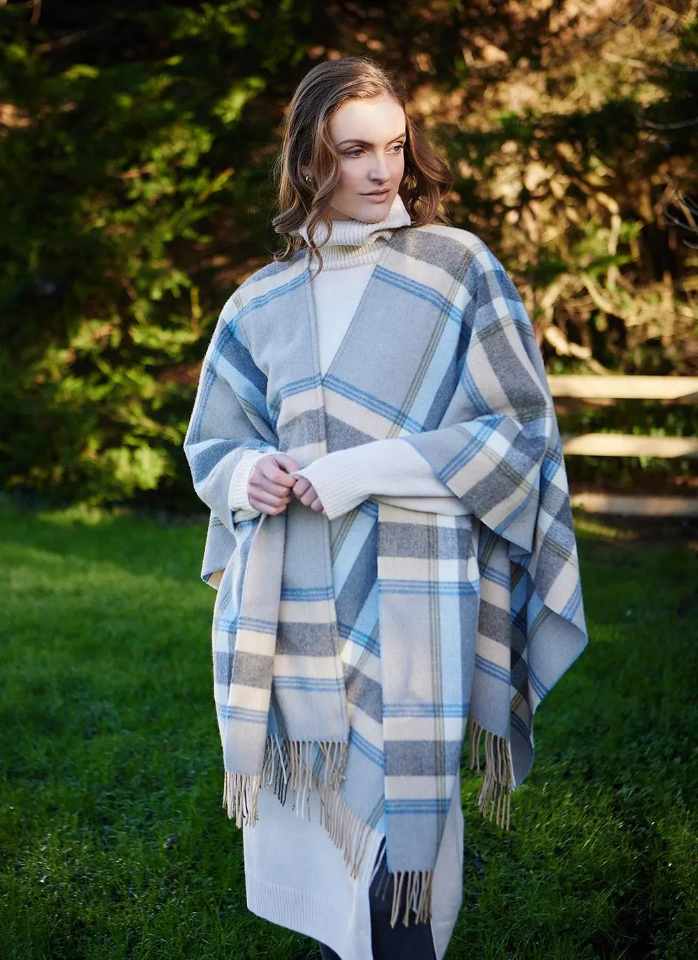 Made in Ireland, our Liz Wrap comes in 100% lambswool, and is woven in a beautiful check pattern with fringed edging. It has a generous length that provides warmth without the bulk of a heavy sweater. A timeless and sophisticated layering piece.Â