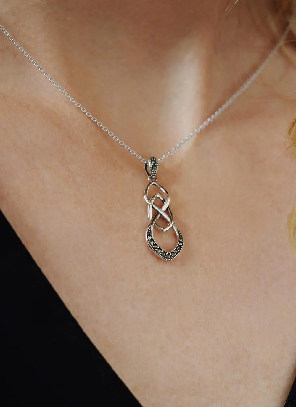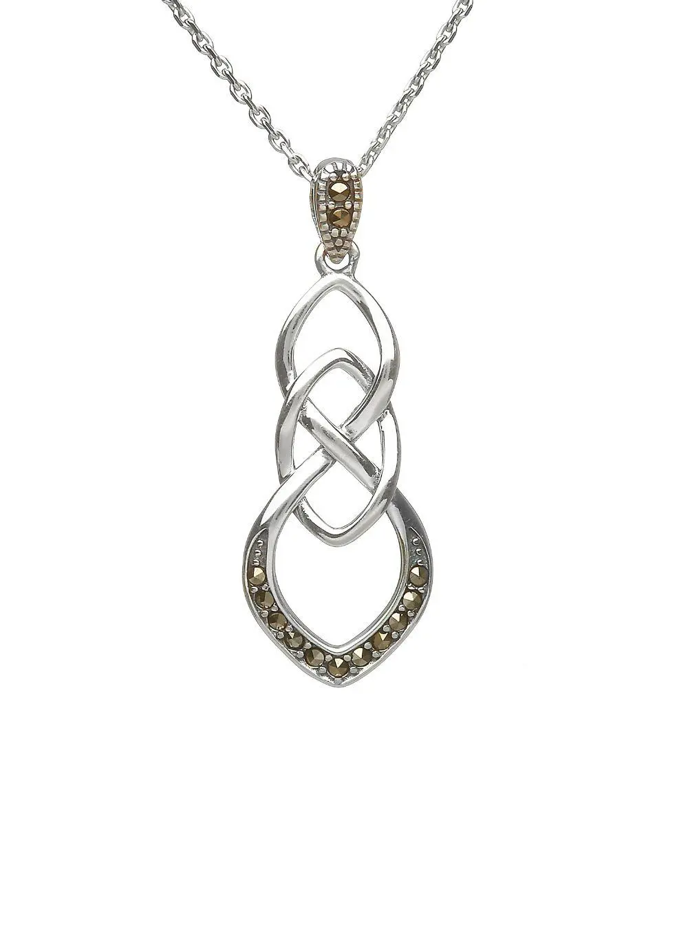 There is something truly enchanting about this sterling silver pendant. It features an infinity loop/Celtic knot motif studded with lustrous marcasite stones, which are said to represent wisdom, courage and expression. Hallmarked in Dublin, this necklace makes a timeless Irish gift for your loved one.