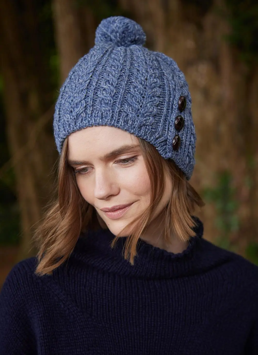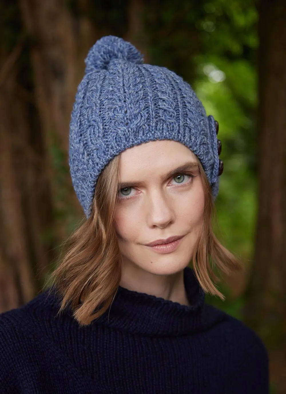 Knit in Ireland from the finest merino wool, this is a beautifully made accessory that provides exceptional warmth. It has an all-over Aran cable design which complements its three leather-look buttons and fluffy pom-pom perfectly.Â