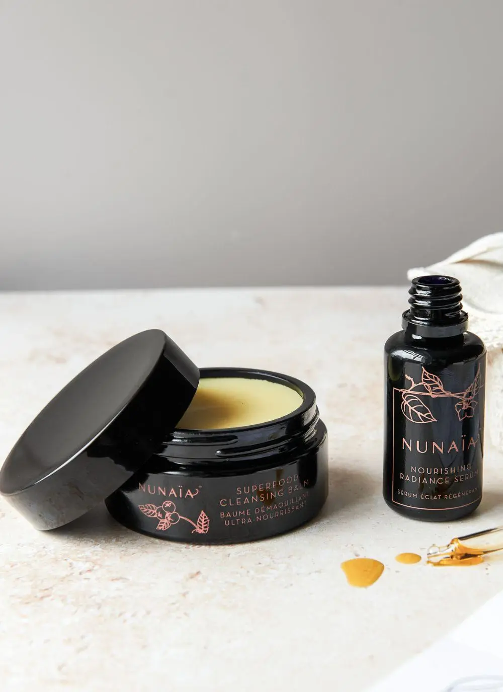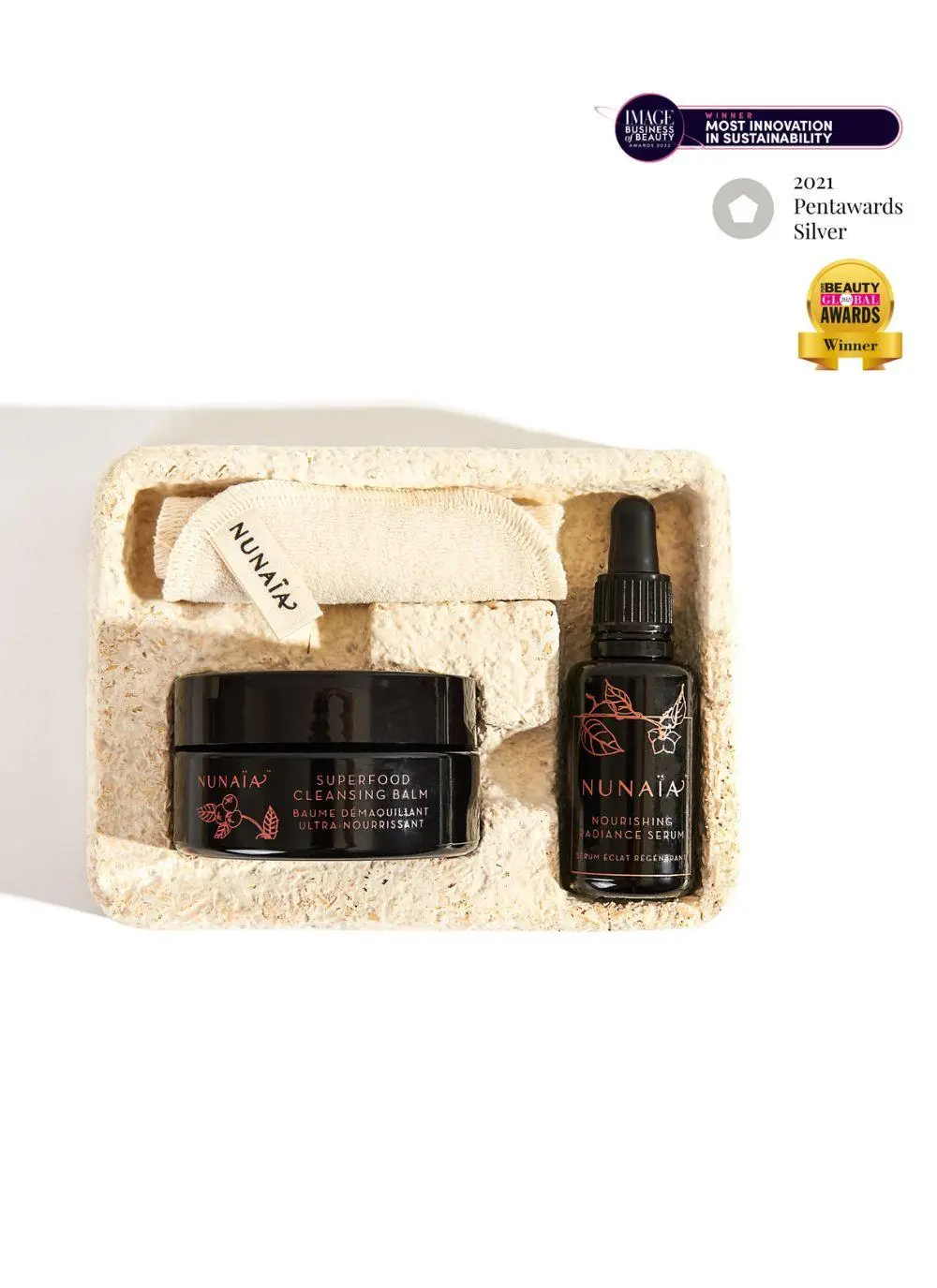 This skincare ritual set has been crafted and designed to nourish, restore and renew not just your skin but your overall well-being and inner balance. It features the award-winning Nourishing Radiance Serum to restore radiance and hydration to the skin, alongside the Superfood Cleansing Balm to deeply cleanse and nourish and a super soft Facial Cleansing Oval to lift away daily impurities.