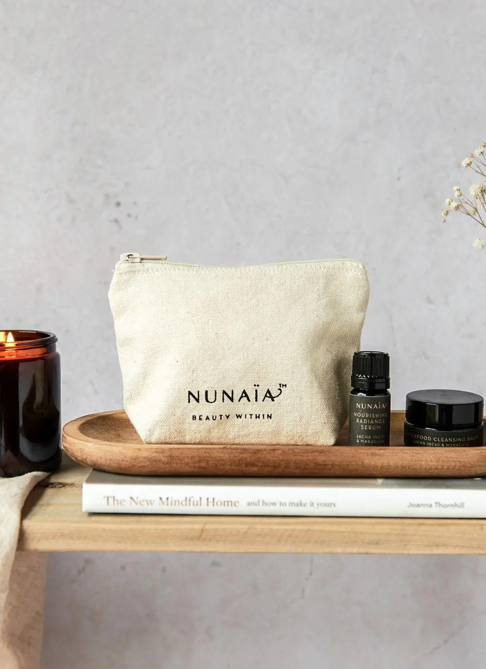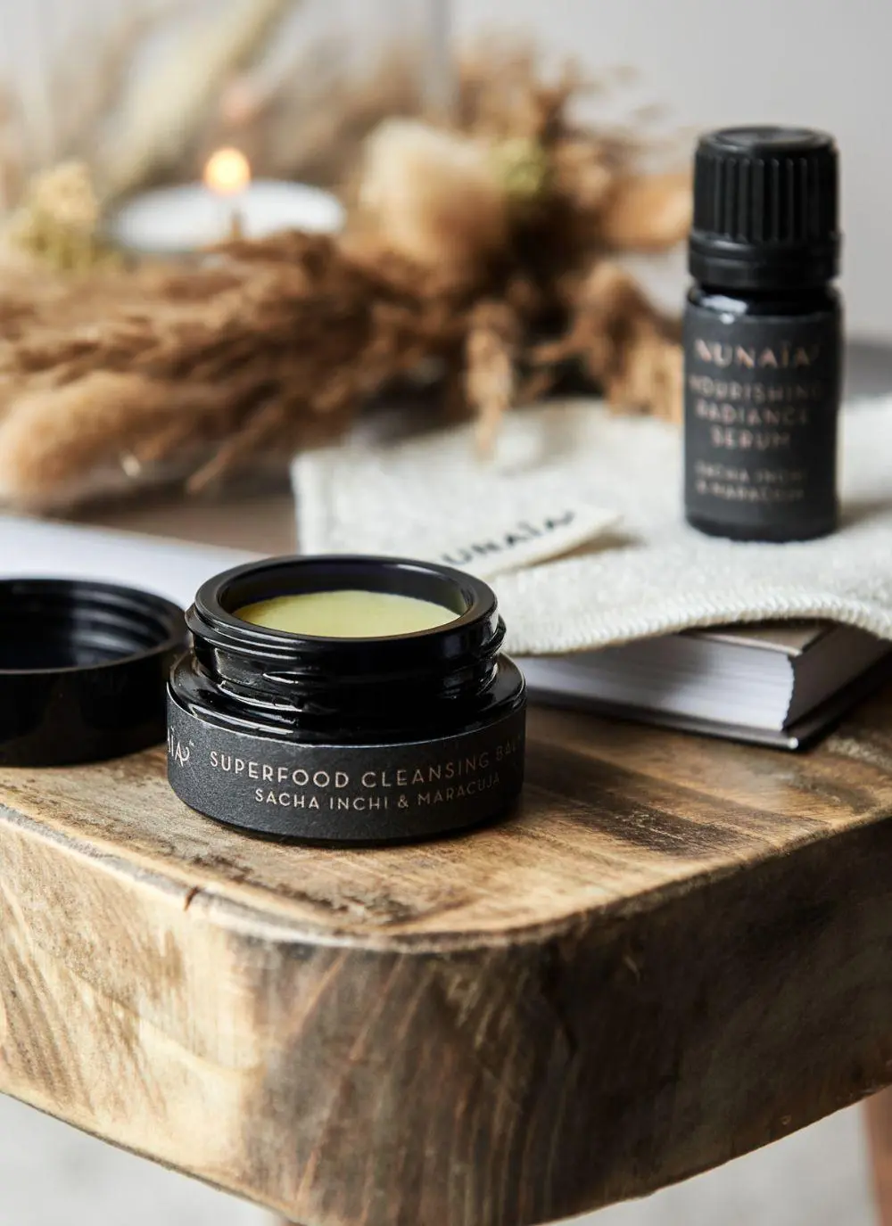 This skincare ritual set has been crafted and designed to nourish, restore and renew not just your skin but your overall well-being and inner balance. It features the award-winning Nourishing Radiance Serum to restore radiance and hydration to the skin, alongside the Superfood Cleansing Balm to deeply cleanse and nourish and a super soft Facial Cleansing Oval to lift away daily impurities. The perfect travel set or to try your own Nunaïa skin ritual at home.