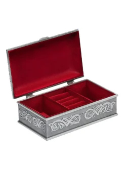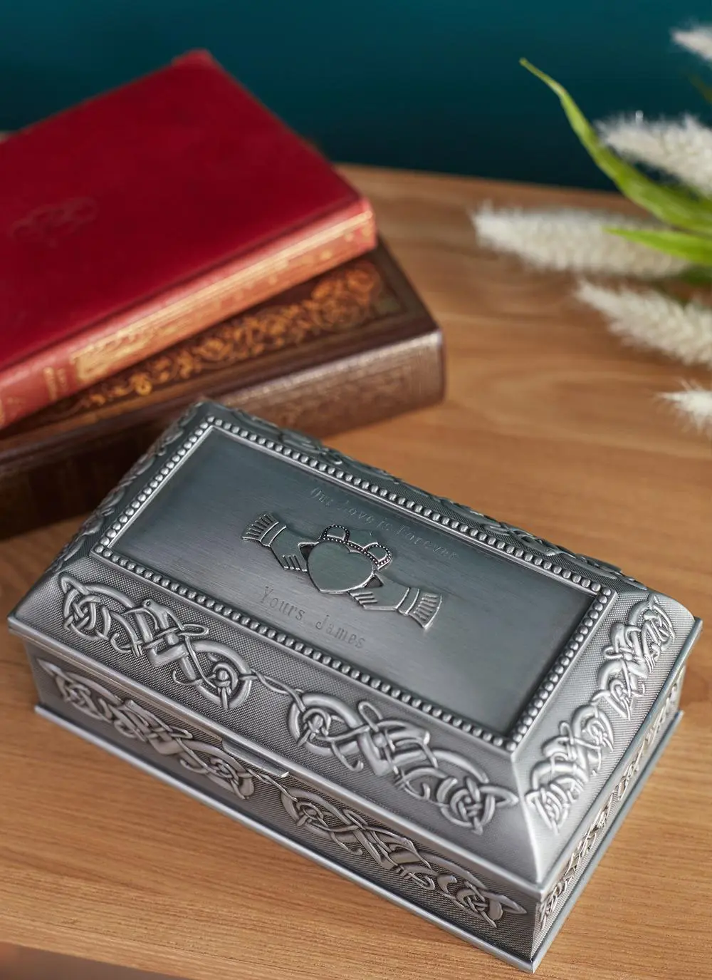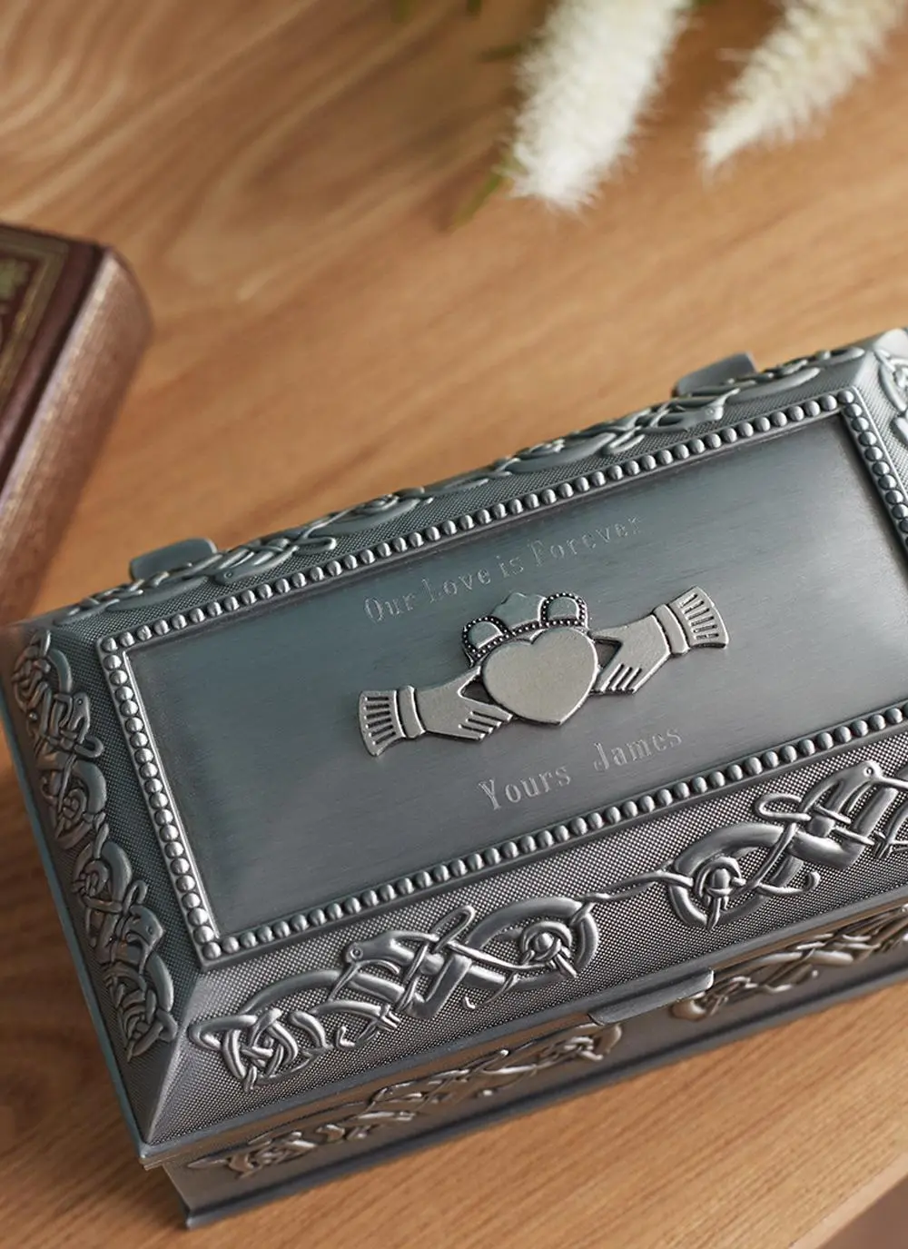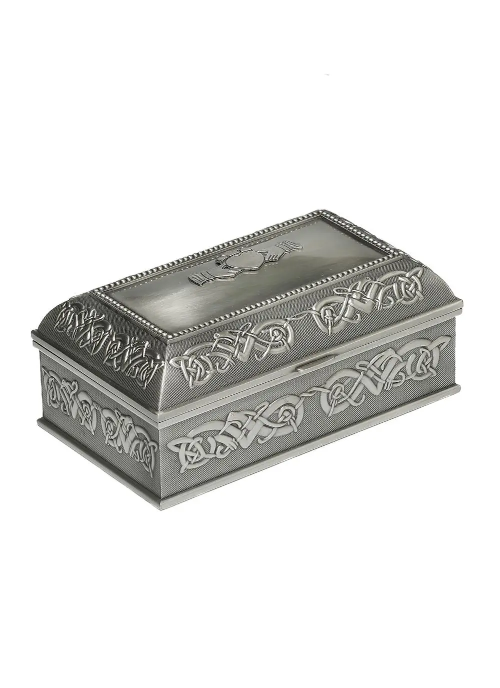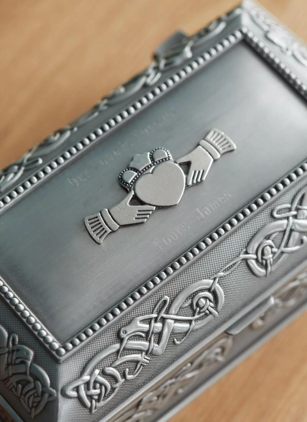Handcrafted in Ireland by Mullingar Pewter, this Celtic jewelry box has been cast in pewter with the Claddagh symbol. The Claddagh represents love (the heart), friendship (the hands) and loyalty(the crown). Beautifully lined with red felt, this personalized jewelry box is perfect for holding all your Celtic Jewelry.