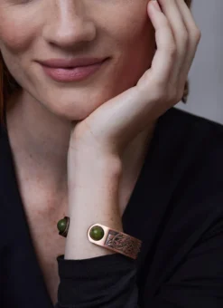 This highly detailed bangle has been made from a pewter base. Its copper finish is accented with an ornate Celtic artwork pattern. Two round pieces of Connemara marble sit on either side of its opening.