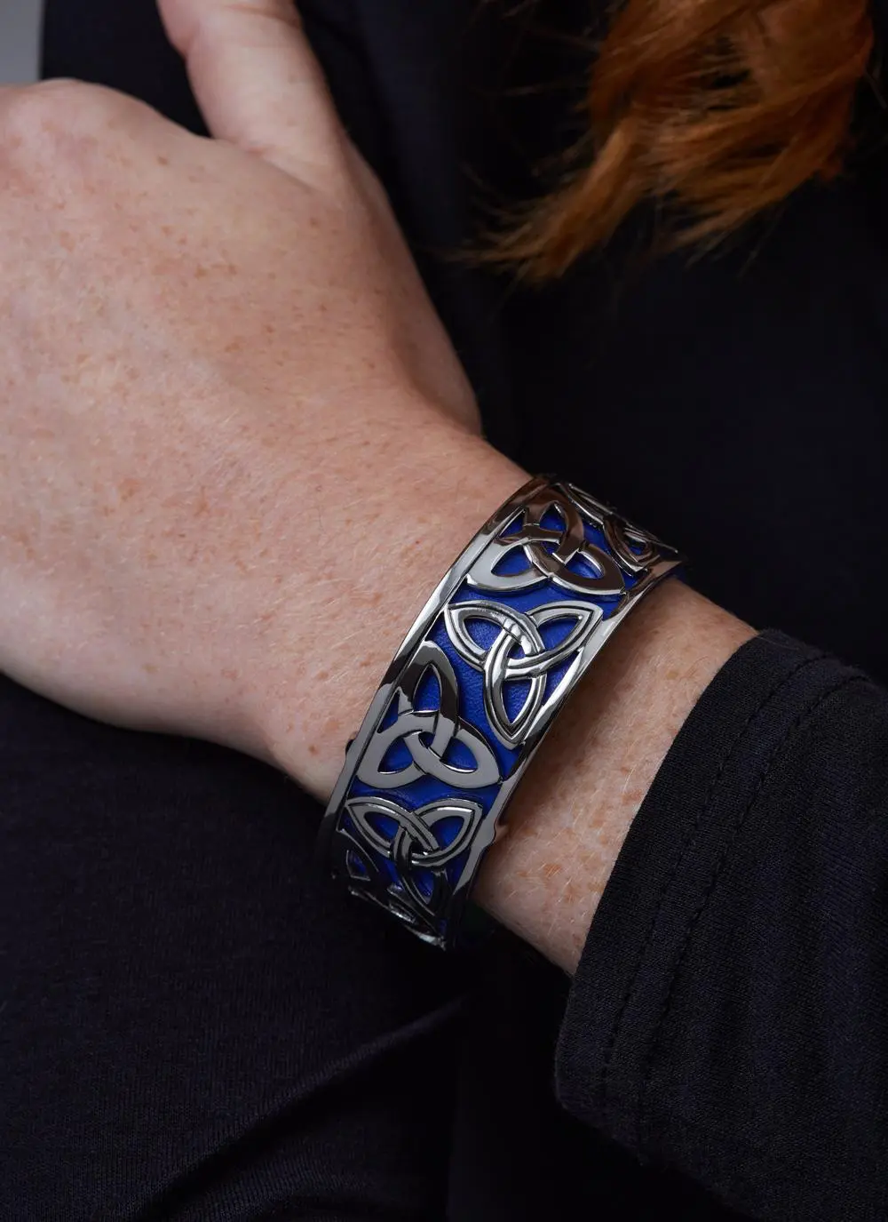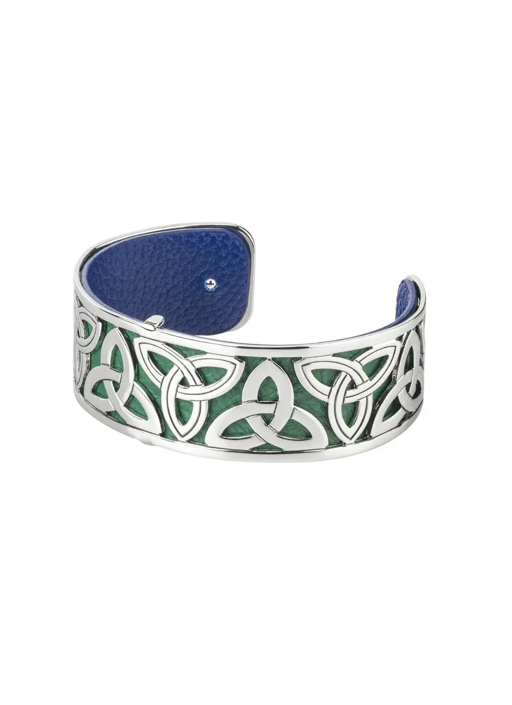 Wear it your way with our rhodium & leather narrow trinity bangle! This bangle is light and playful with its stunning Trinity knot cut-out design. The leather insert is reversible and offers two different colors to match your mood! It can alternatively be worn without the insert.