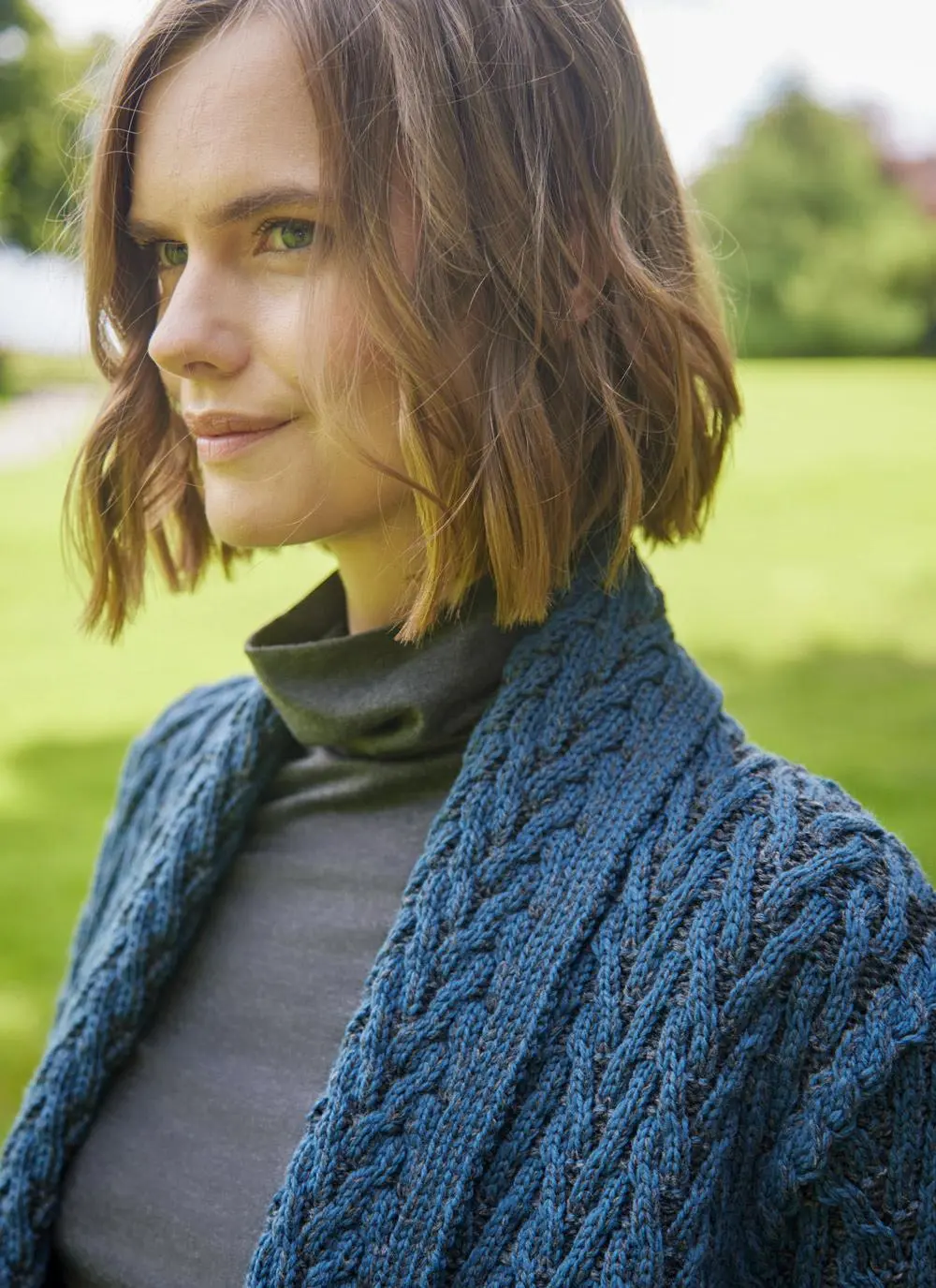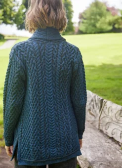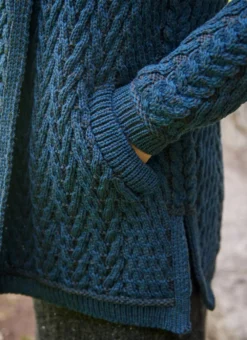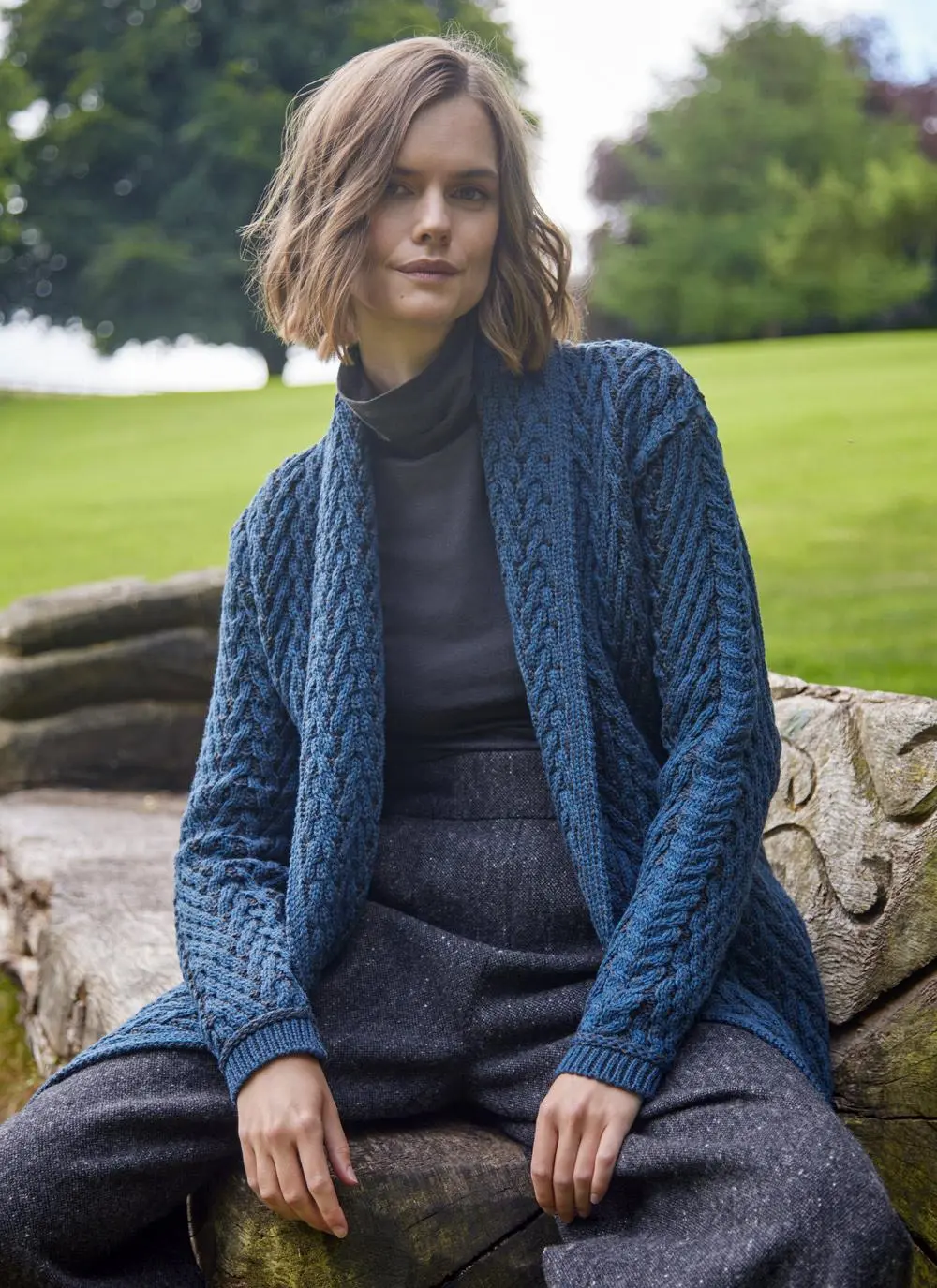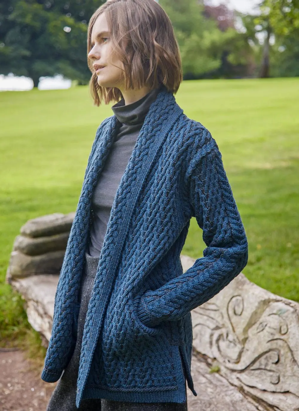 Made in Ireland from the finest quality merino wool, our Riona Aran cardigan is an ageless knitwear staple. It has an elegant open drape style with two functional side pockets and an all-over plaited finish for a two-tone effect. The side slits add a contemporary touch that will elevate any ensemble.