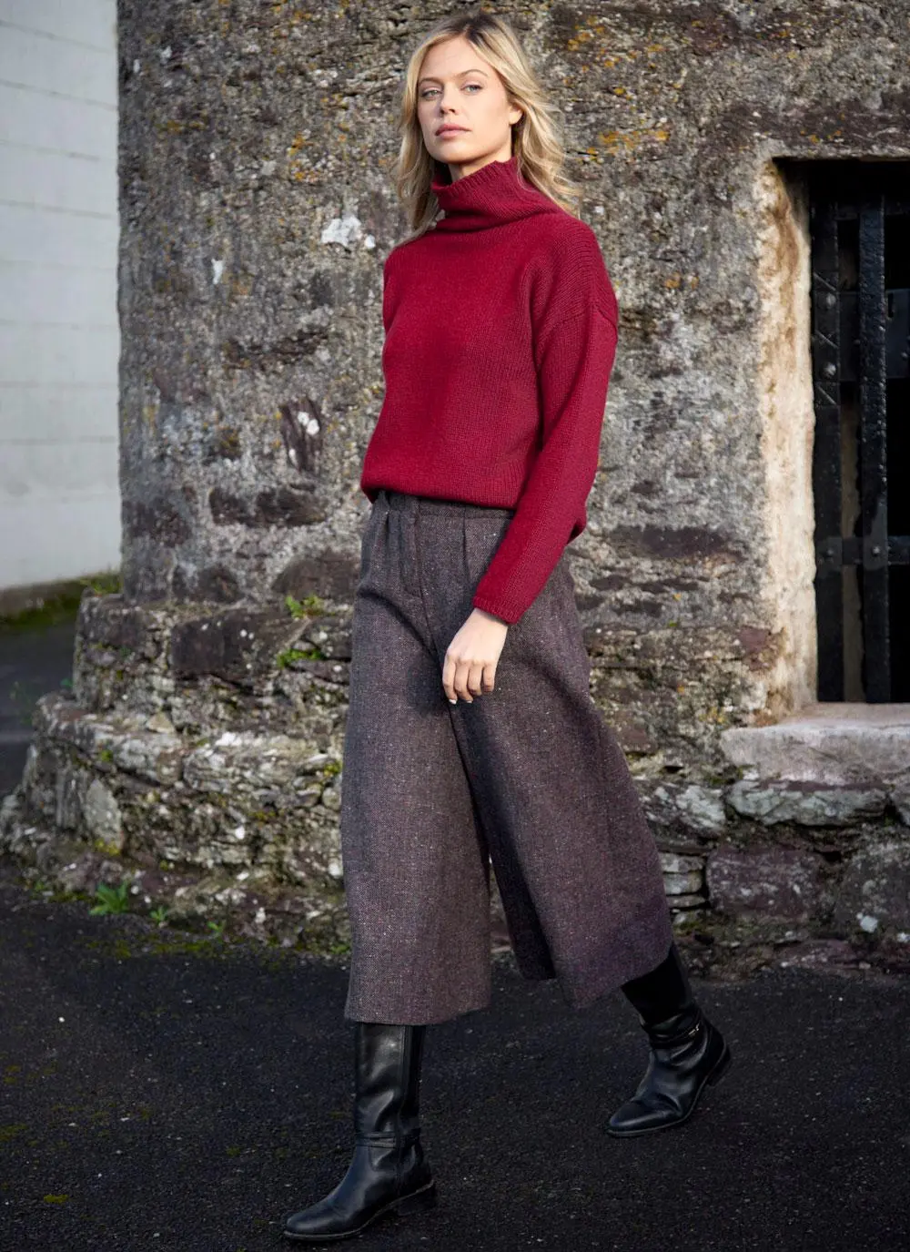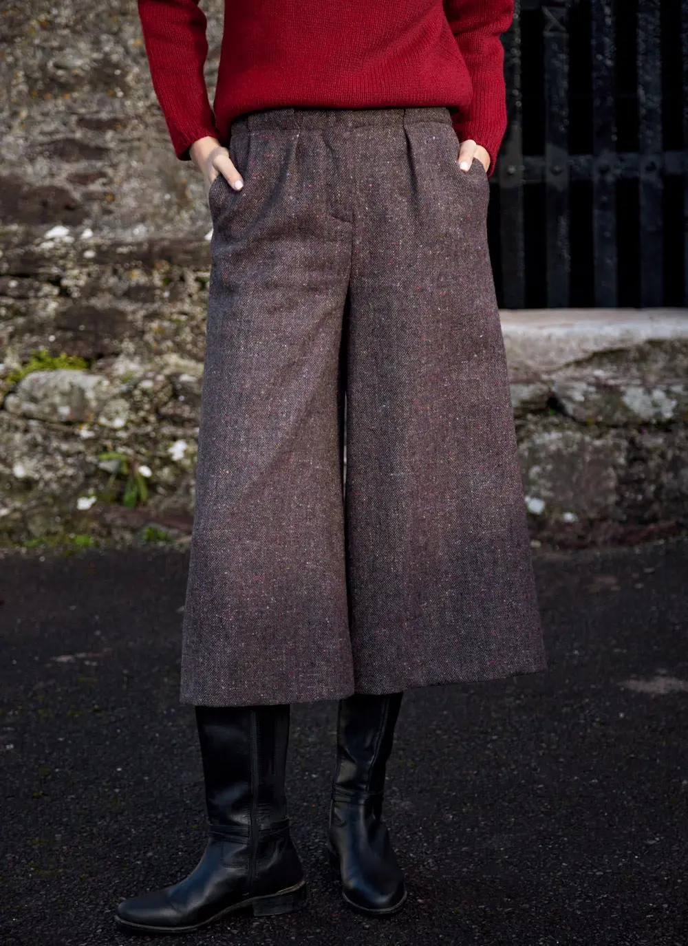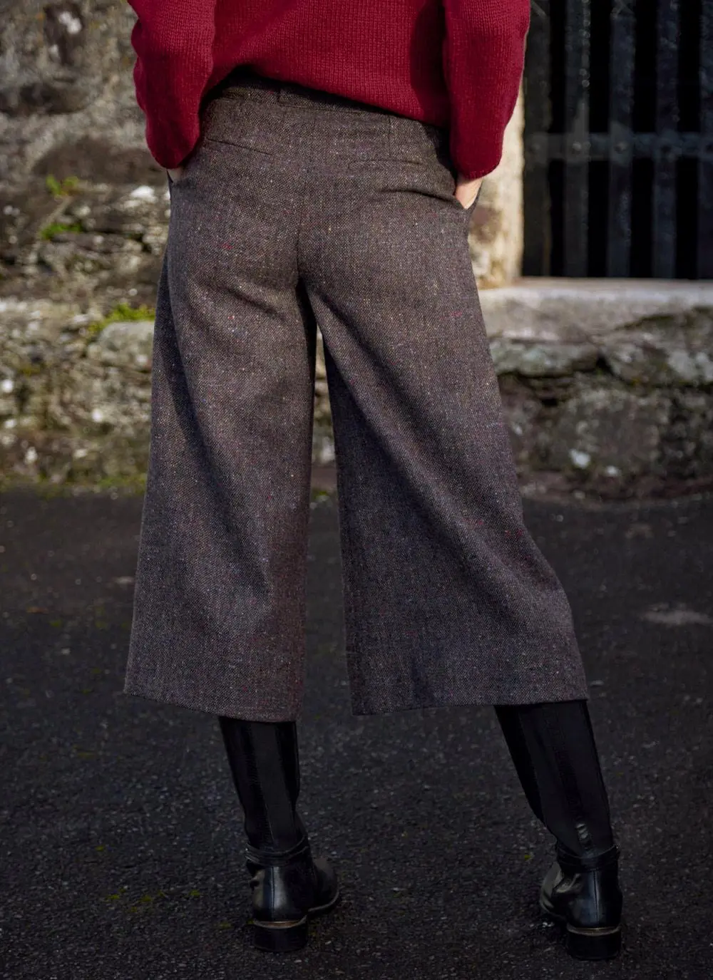 Our exclusive culotte trousers combine the silhouette of a skirt with the ease of trousers. Flawlessly made with salt-and-pepper Irish tweed, they have a textured, tonal look that makes matching effortless. The high waist with two pleats creates a flattering shape with timeless appeal.Â