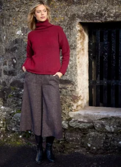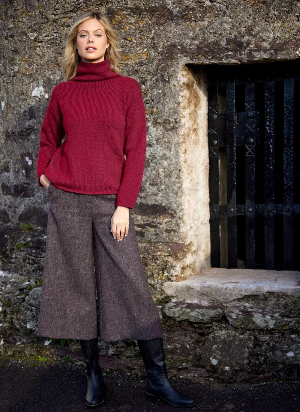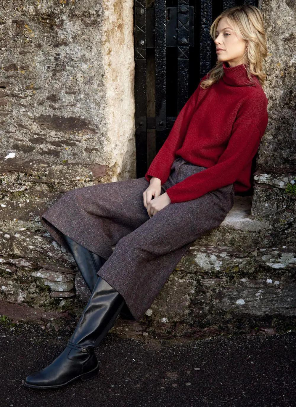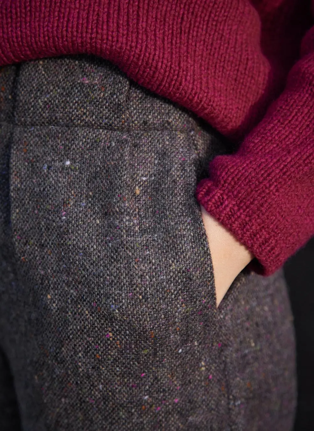 Our exclusive culotte trousers combine the silhouette of a skirt with the ease of trousers. Flawlessly made with salt-and-pepper Irish tweed, they have a textured, tonal look that makes matching effortless. The high waist with two pleats creates a flattering shape with timeless appeal.Â