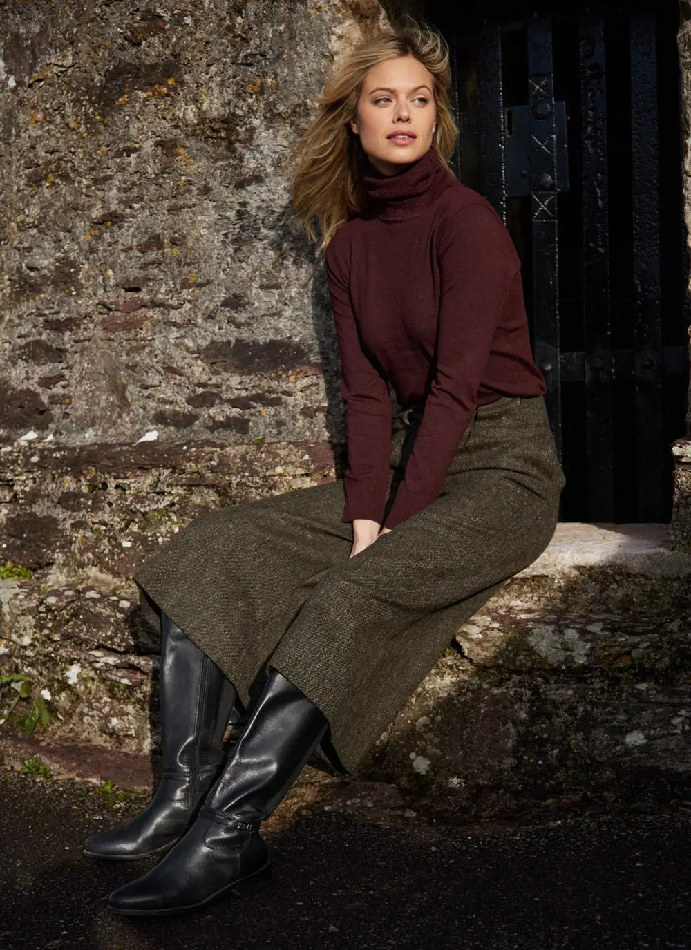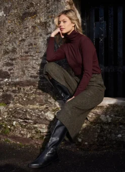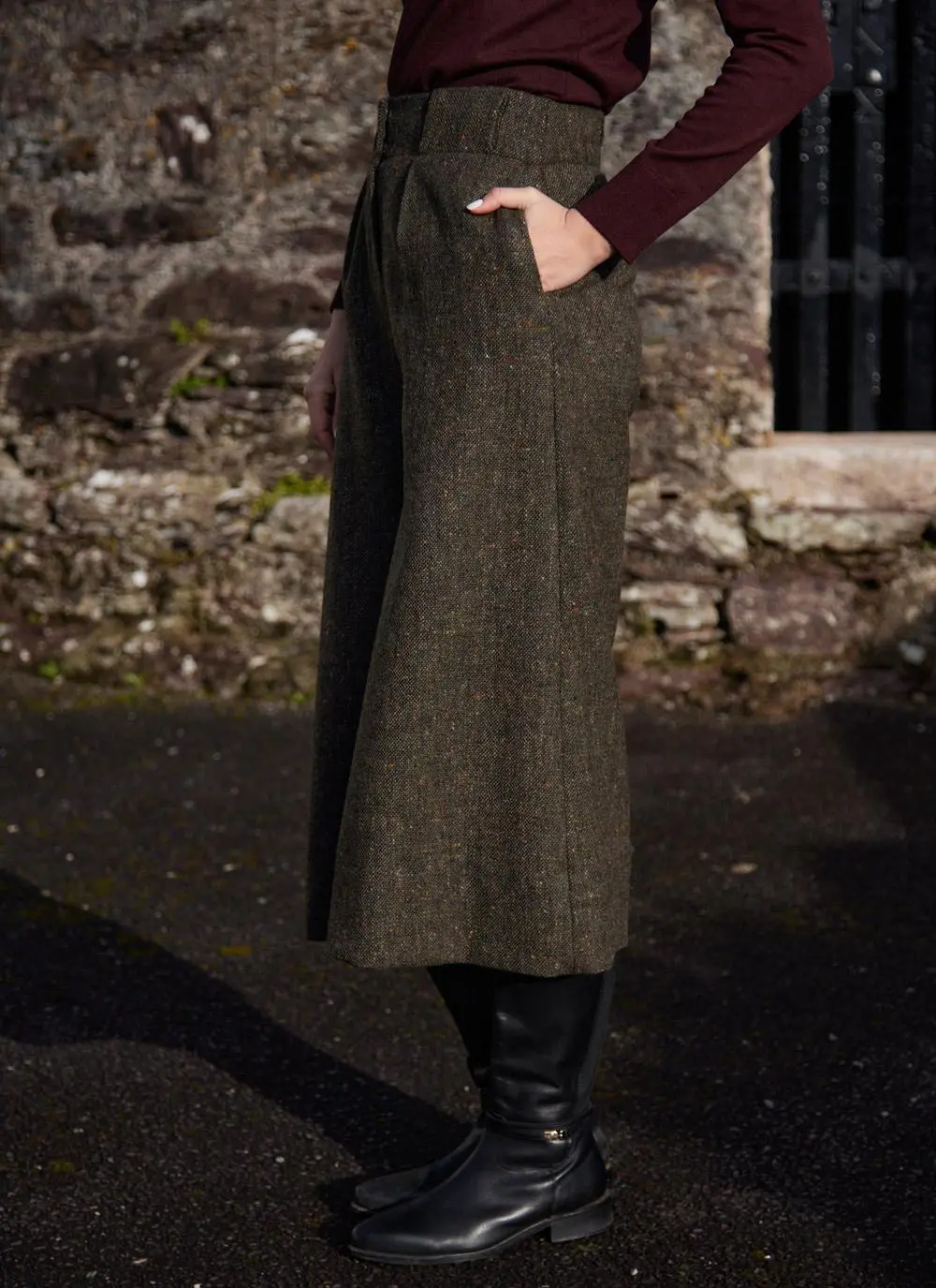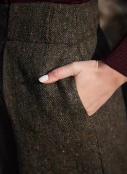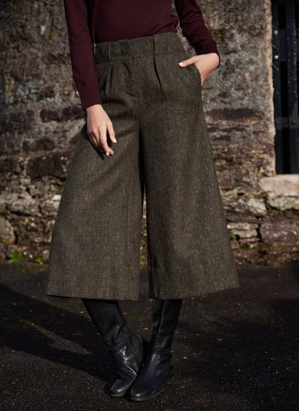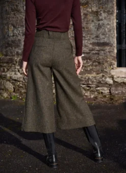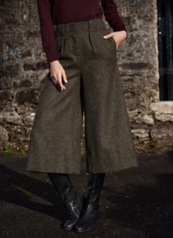 Our exclusive culotte trousers combine the silhouette of a skirt with the ease of trousers. Flawlessly made with salt-and-pepper Irish tweed, they have a textured, tonal look that makes matching effortless. The high waist with two pleats creates a flattering shape with timeless appeal.Â