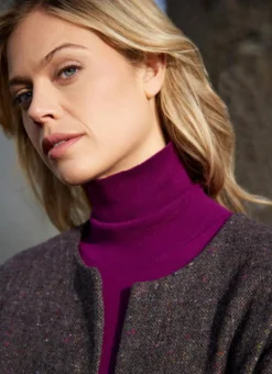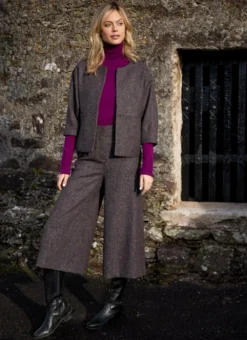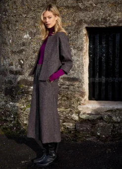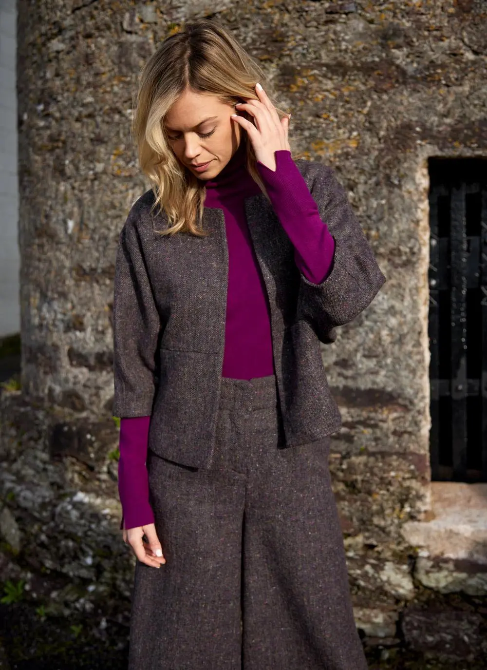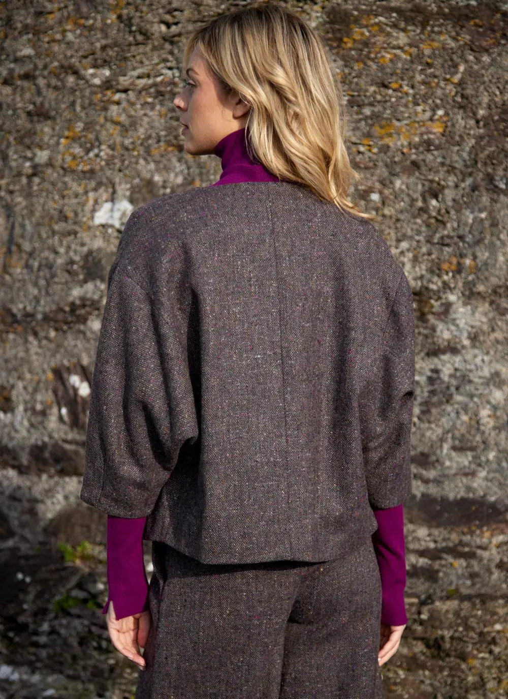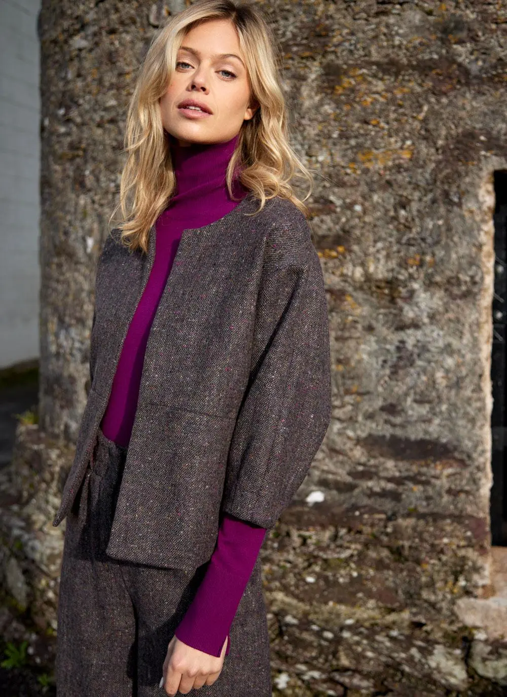 Our short salt and pepper jacket is both ageless and fashion-forward. Flawlessly tailored with crease-resistant Irish tweed, it is flecked with subtle pops of color that make matching effortless. We love the understated elegance of the round collarless neckline and the relaxed fit which allows for versatile layering.