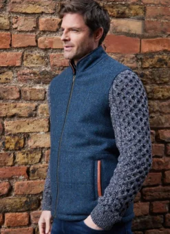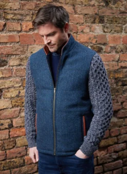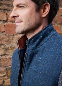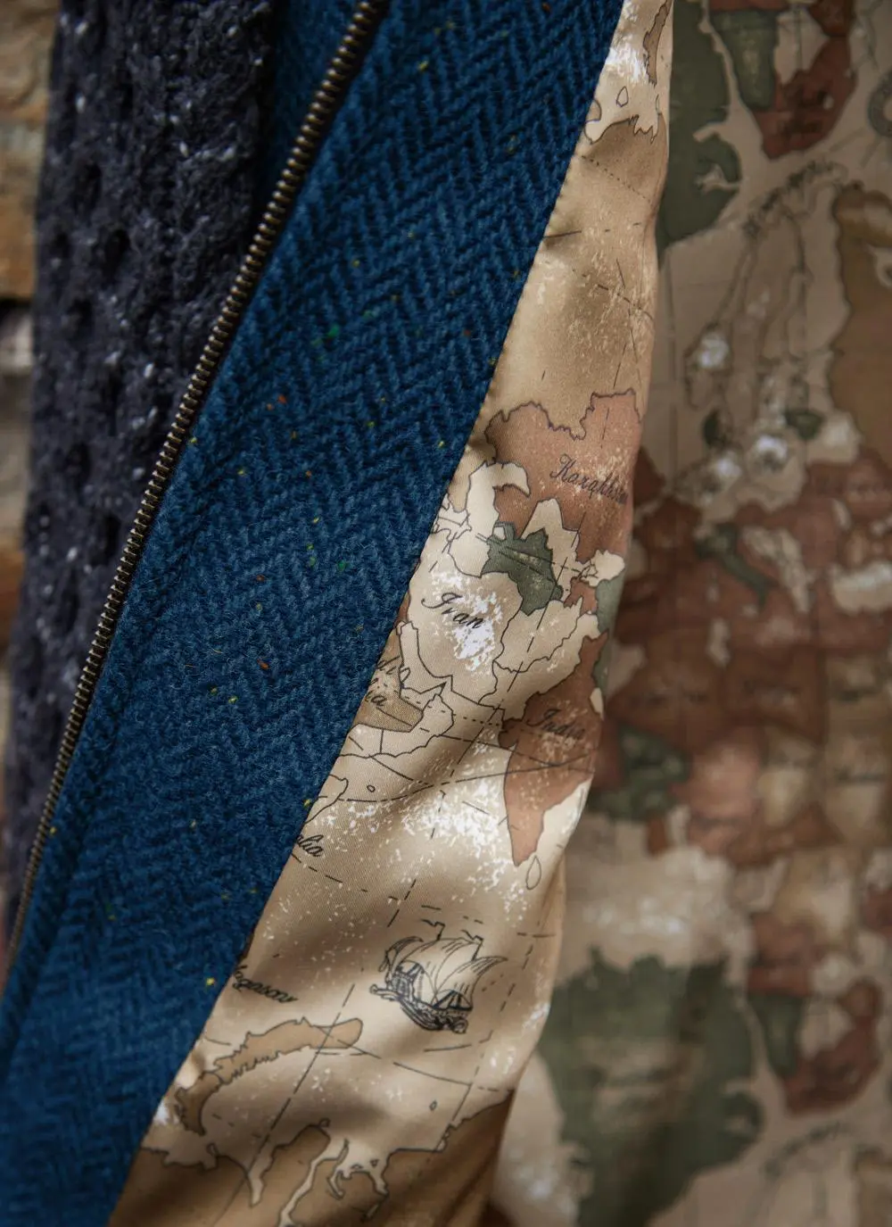 A fusion of textiles, the Shackleton Jacket is distinctive in every way. The body of the jacket is woven in a flecked herringbone Irish tweed with a tall collar, two real leather size zip pockets and a full-zip fastening. In contrast, the sleeves are knit in a luxurious flecked cashmere blend with Aran honeycomb and cable stitching throughout. The satin lining depicts a vintage map print that adds further style and character.