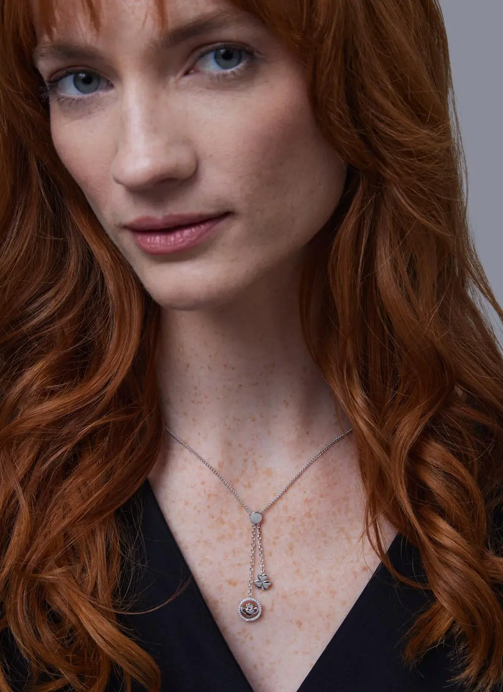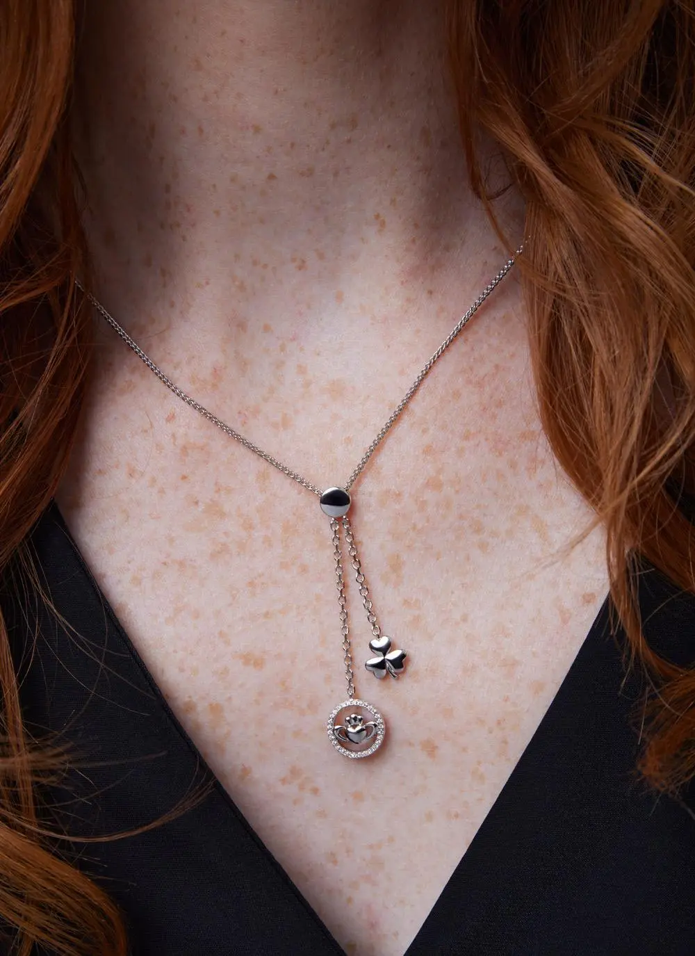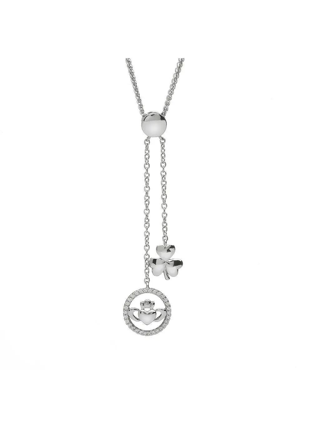Wear your heritage with style with our shamrock & claddagh two-drop silver pendant. Boasting two beautiful charms, this pendant features a sparkling Claddagh and a classic shamrock charm, two Irish symbols which are famous the world over.