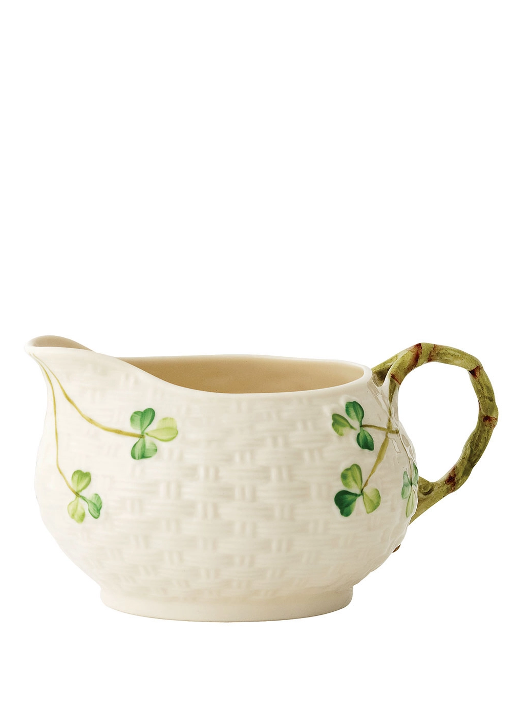 This unique Belleek fine Parian china cream jug features beautifully handcrafted embossed weaves and a branch-like handle, creating a piece that is highly distinctive.