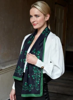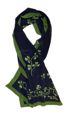 On St. Patrick’s Day, people all over the world are united in their appreciation of all things Irish. The symbol of the shamrock is an Irish icon and adorns our beautiful navy scarf in 100% silk. Many view the shamrock as a Celtic symbol for good luck, but St Patrick, it is said, used it to symbolize that Faith, Hope & Love are all grown from one stem.