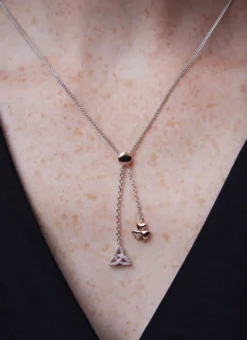 Featuring two delicate charms, this beautiful pendant is sure to delight and impress. The pendant features an elegant rose gold shamrock charm as well as a silver trinity knot charm, embellished with cubic zirconia.