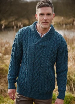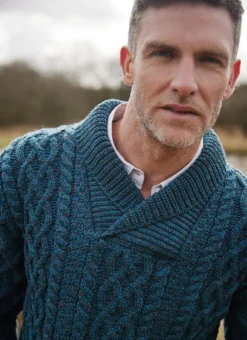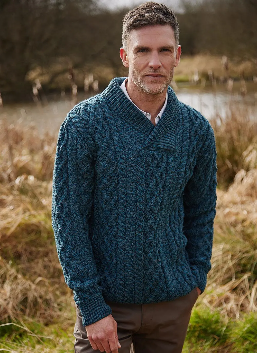 This timeless Aran sweater has an all-over cable stitch pattern. Knit in Ireland using the finest merino wool, it provides warmth and comfort without compromising style. We love the ribbed shawl collar which is perfect for layering over shirts or a tee.