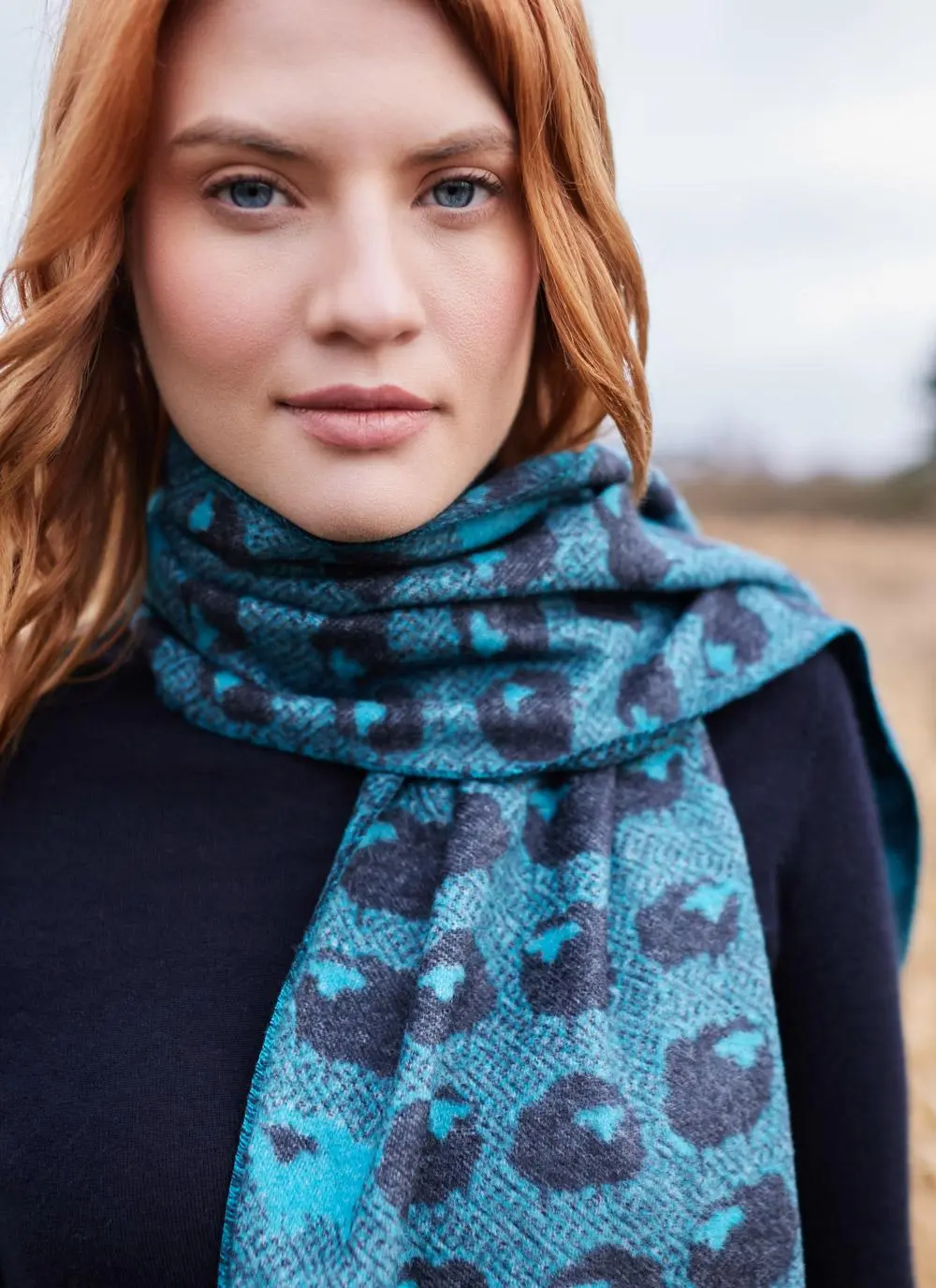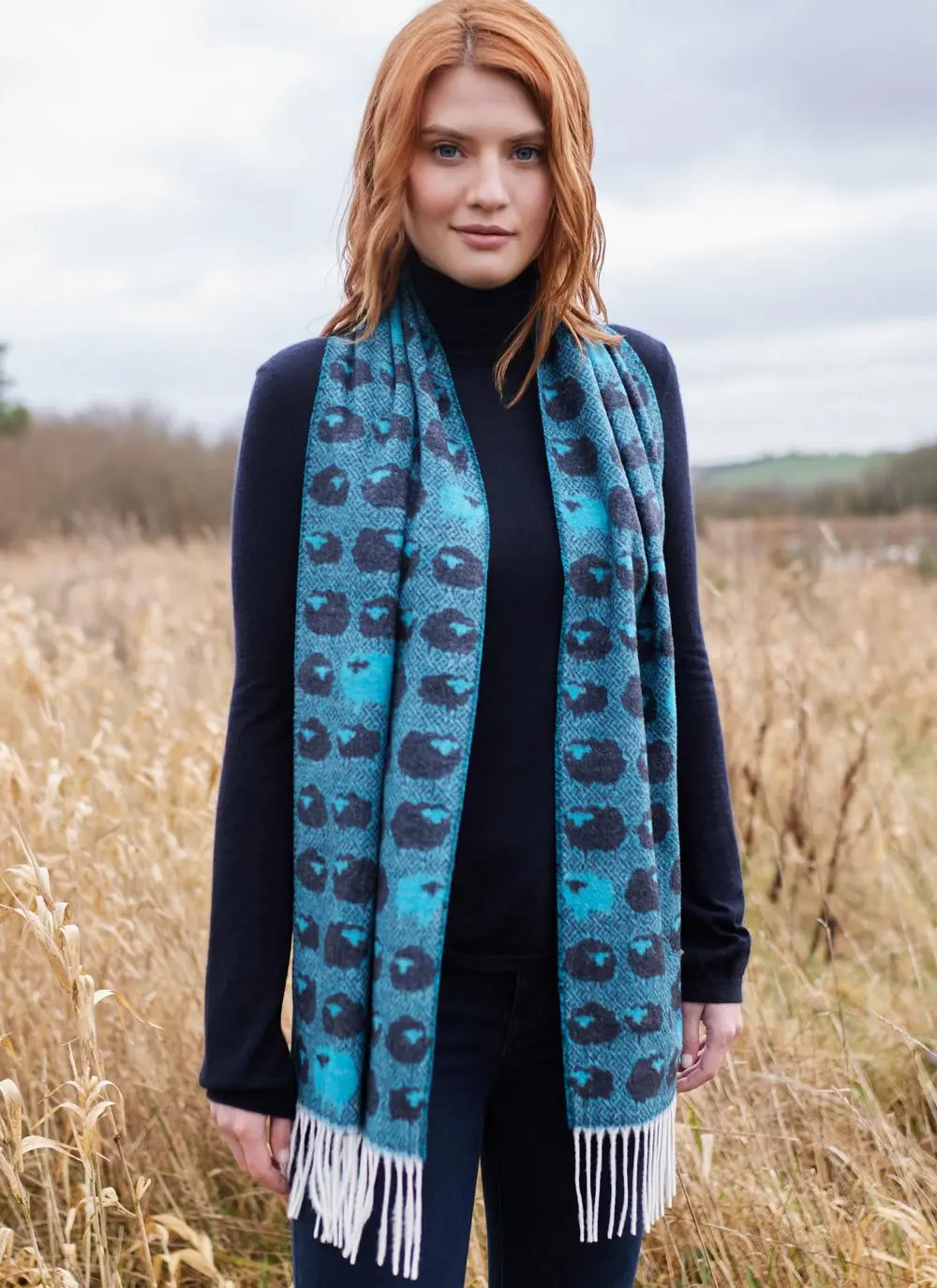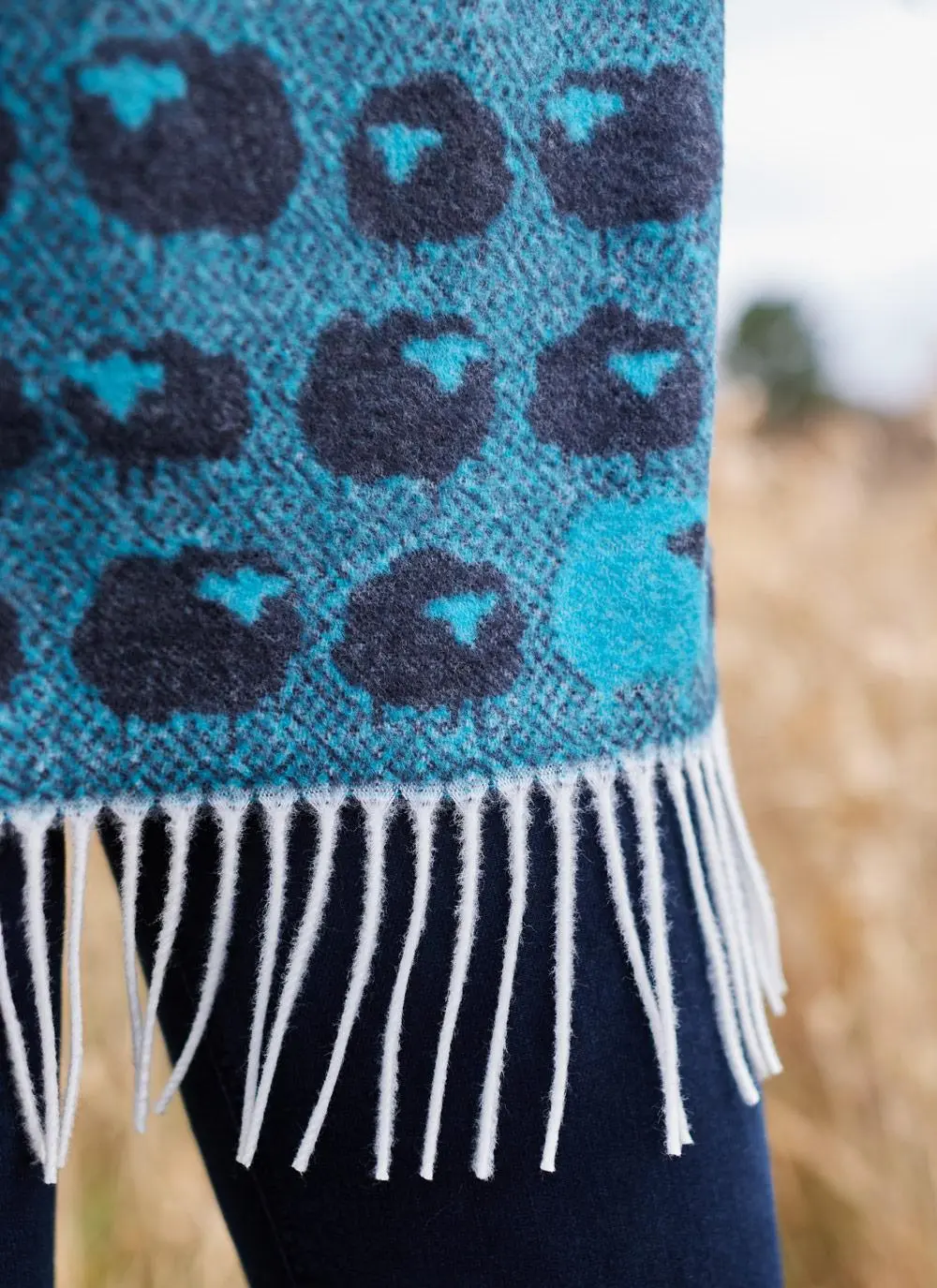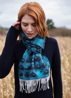 Chic and whimsical, this scarf adds a stylish touch to any ensemble. It is embroidered with a motif of cloud-like sheep in turquoise blue and navy. Finished with contrasting white fringing.