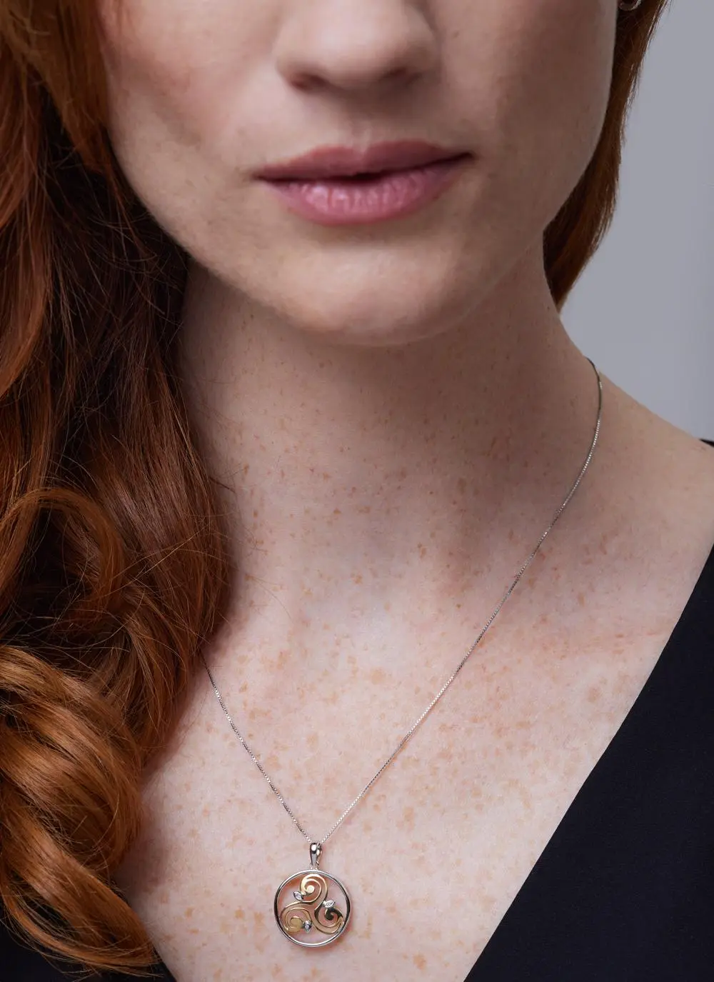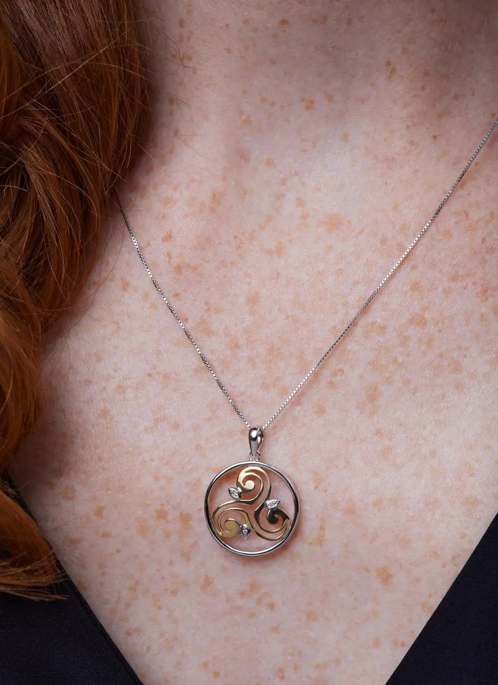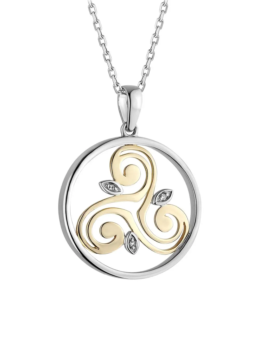 Evoking the Celtic concept of the domains of material existence – earth, water, and sky – the triskele, also known as the Celtic spiral, is an ancient Celtic symbol relating to the sun, afterlife and reincarnation. The glistening 10K yellow gold of this pendant is enhanced by three teardrop shaped diamonds.