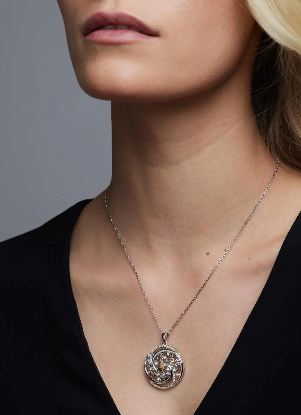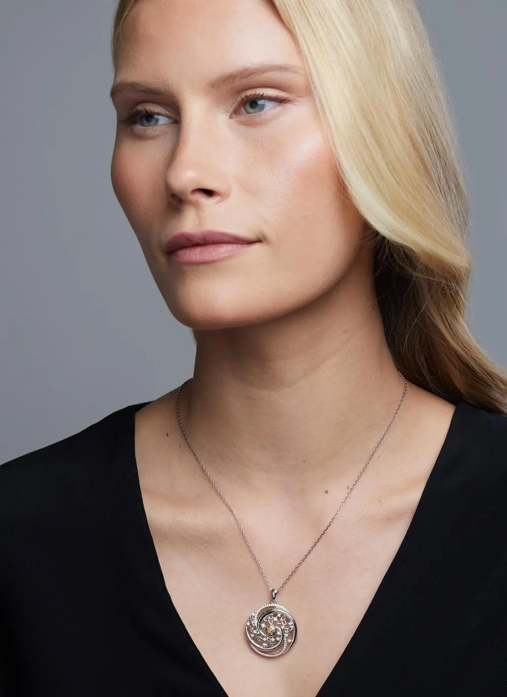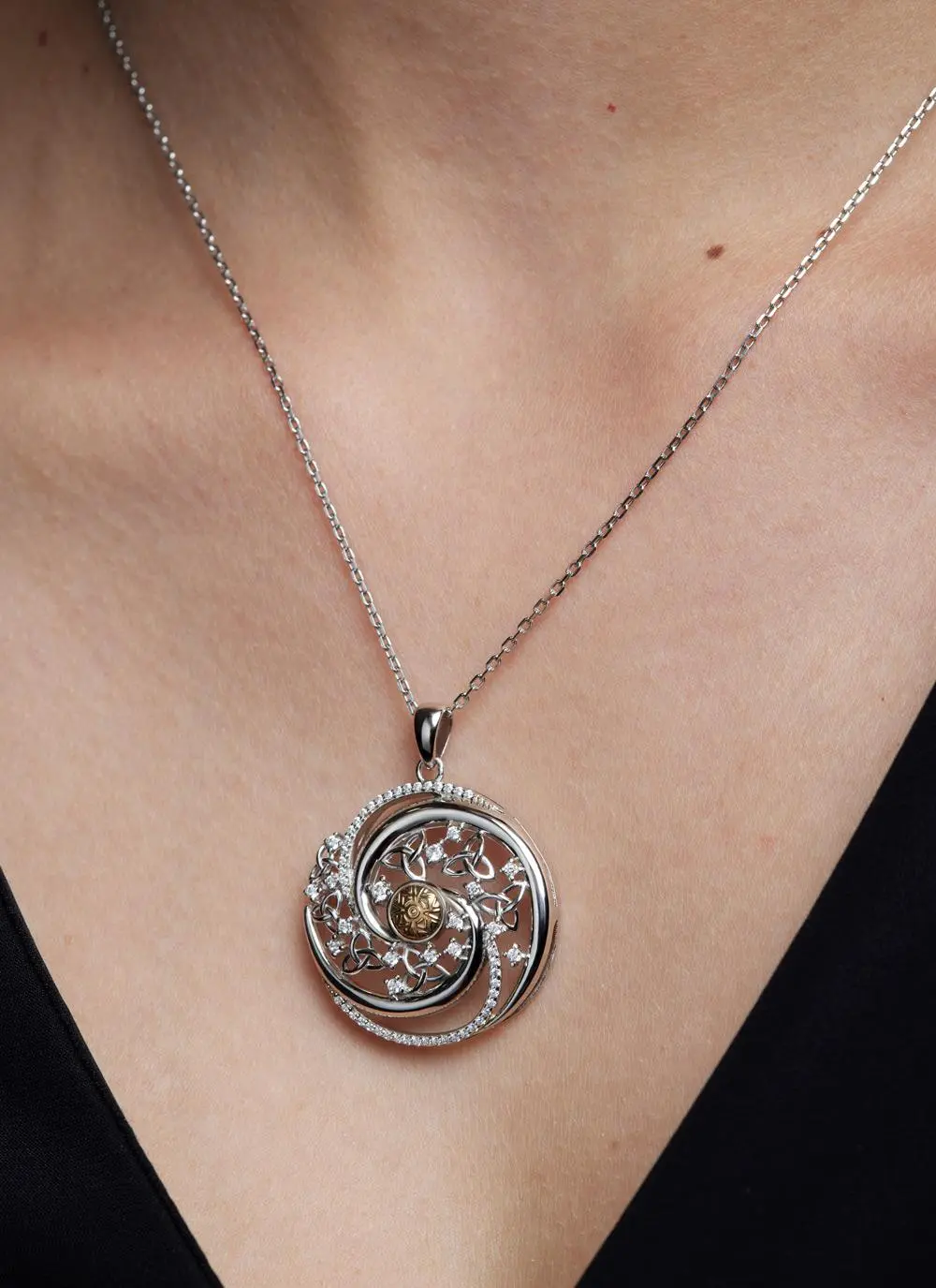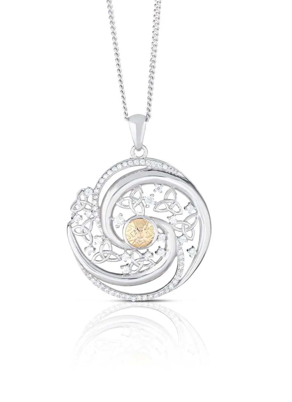 Inspired by the Winter Solstice, this pendant features swirls and trinity knots enhanced with glistening cubic zirconia stones. At the center, sits a 18K yellow gold bead. The Winter Solstice is a Celtic celebration of the shortest day, and longest night, of the year. It is thought to be a period of quiet energy. It is also a time to set goals and intentions for the coming year, examine and release your past and to make positive personal changes.