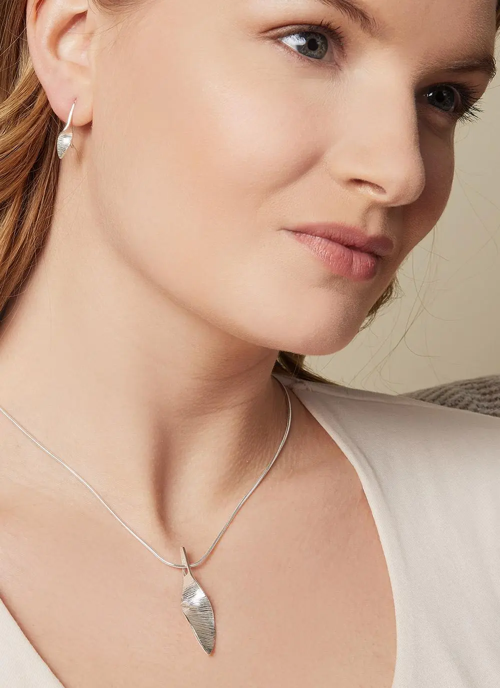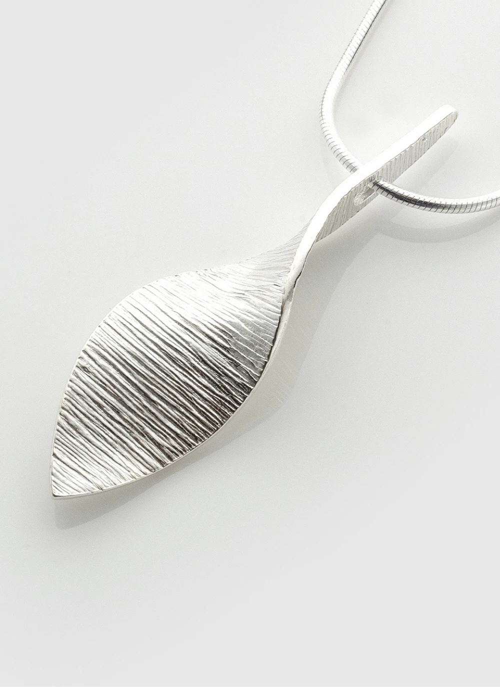 Make a statement with this elegant contemporary necklace by Irish jewelry designer Martina Hamilton. As part of the Bean Rà (She King) collection, it is inspired by the mythological warrior queens of ancient Ireland and modeled on bronze age spear heads. From a slinky snake chain hangs a textured, flame-like pendant which catches the light beautifully thanks to its quarter turn. Handcrafted in Ireland using the finest sterling silver.