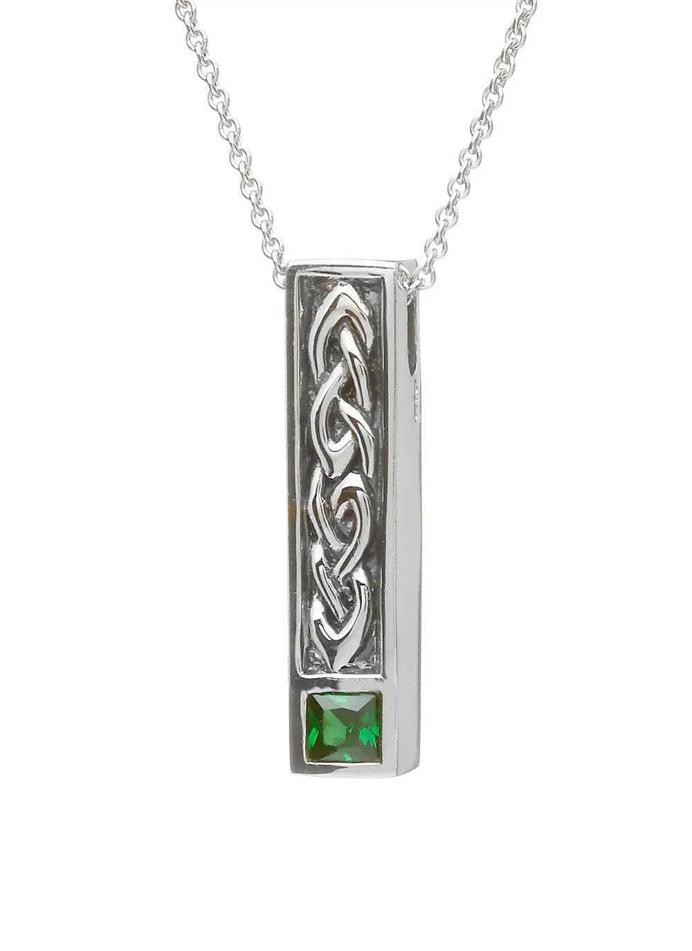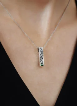 Keep your Irish roots close to your heart with this elegant bar pendant. Crafted in Ireland from sterling silver, it is set with a dazzling green cubic zirconia and features an embossed Celtic knot motif. A timeless Irish gift for the jewelry collector in your life.