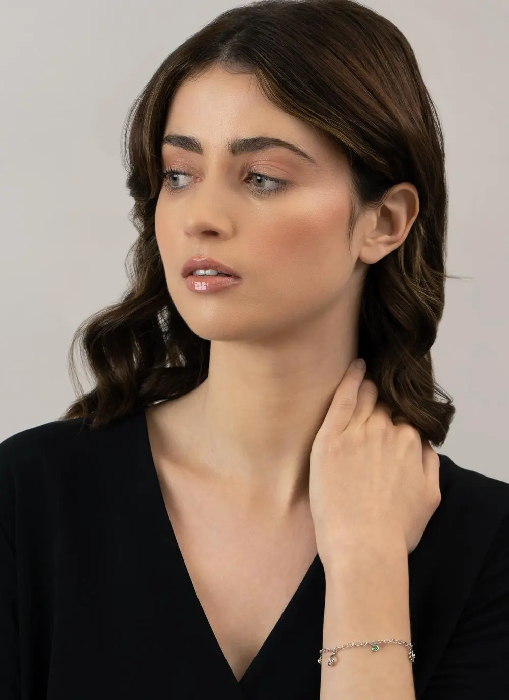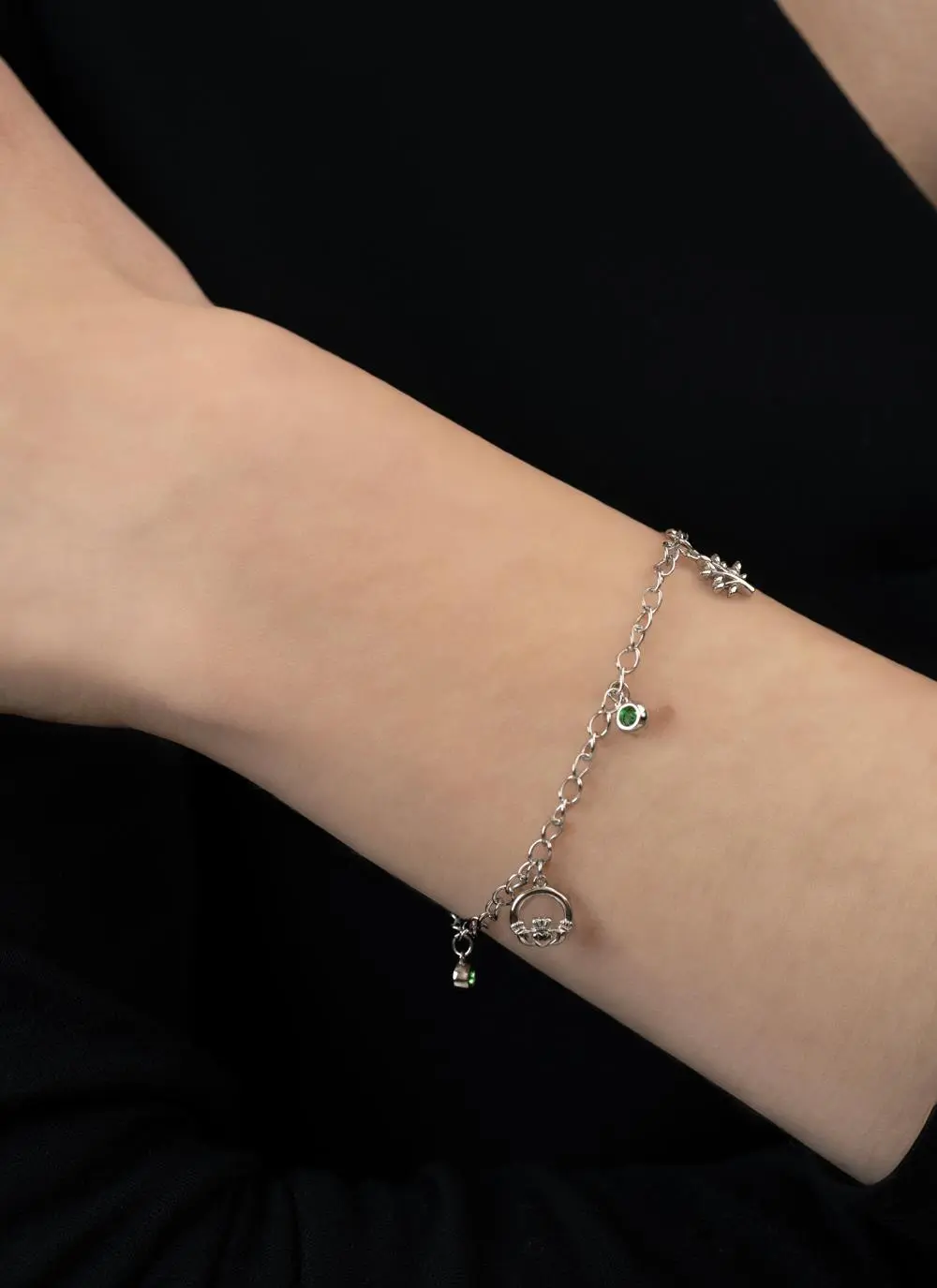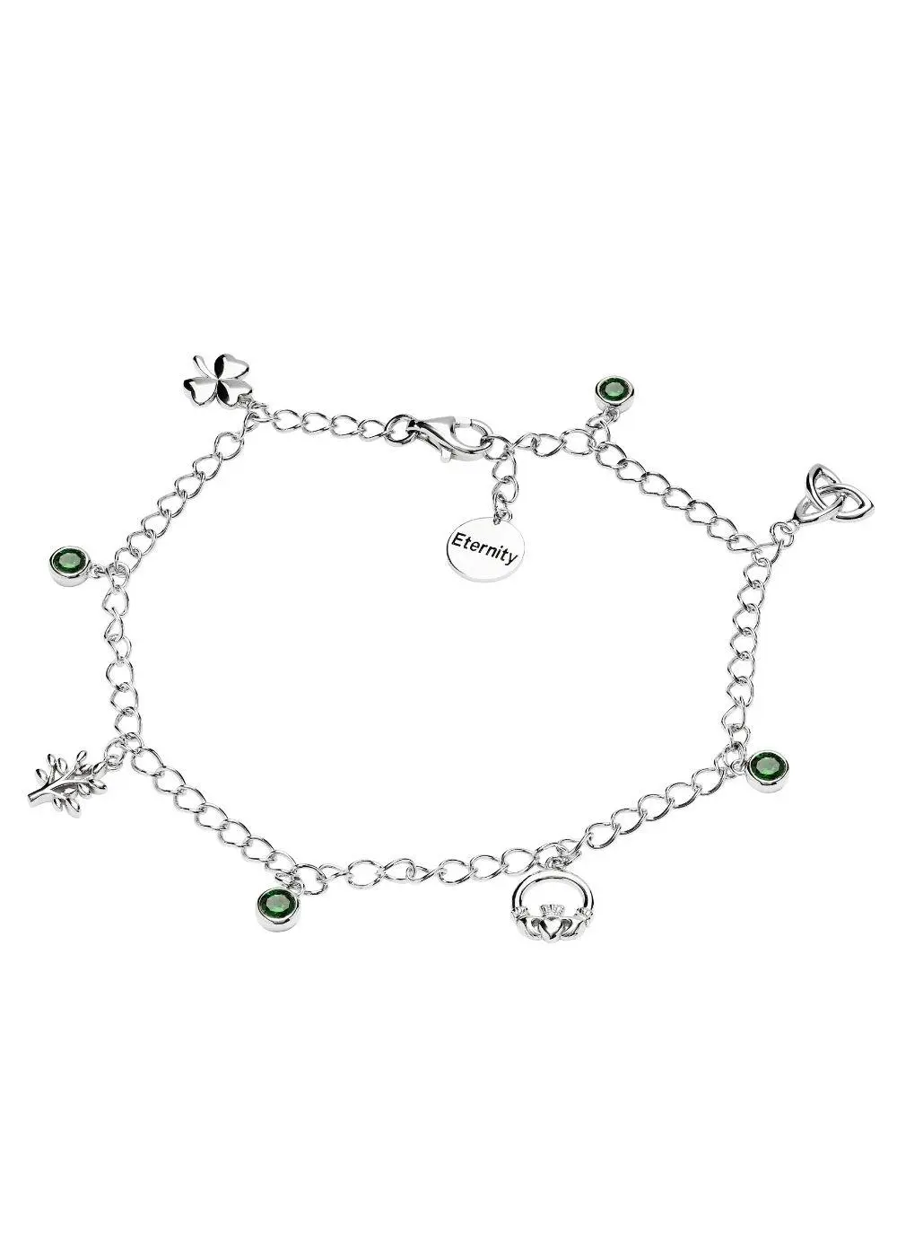 This charm-style Celtic bracelet is a truly unique piece to be cherished for a lifetime. It features much-loved Irish symbols such as the shamrock, trinity knot, Claddagh and tree of life, as well as dazzling emerald-green cubic zirconia stones. Crafted in Ireland using the finest sterling silver, this delicate bracelet makes a timeless gift for a special someone.