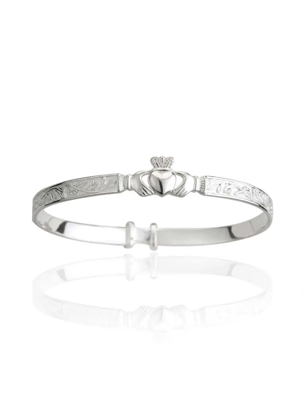 This sterling silver Claddagh bangle features the important Irish Claddagh symbol. The hands of the Claddagh represent friendship, the heart stands for love, and the crown represents loyalty. This bangle is expandable making it a unique new baby or christening gift to celebrate Irish heritage.