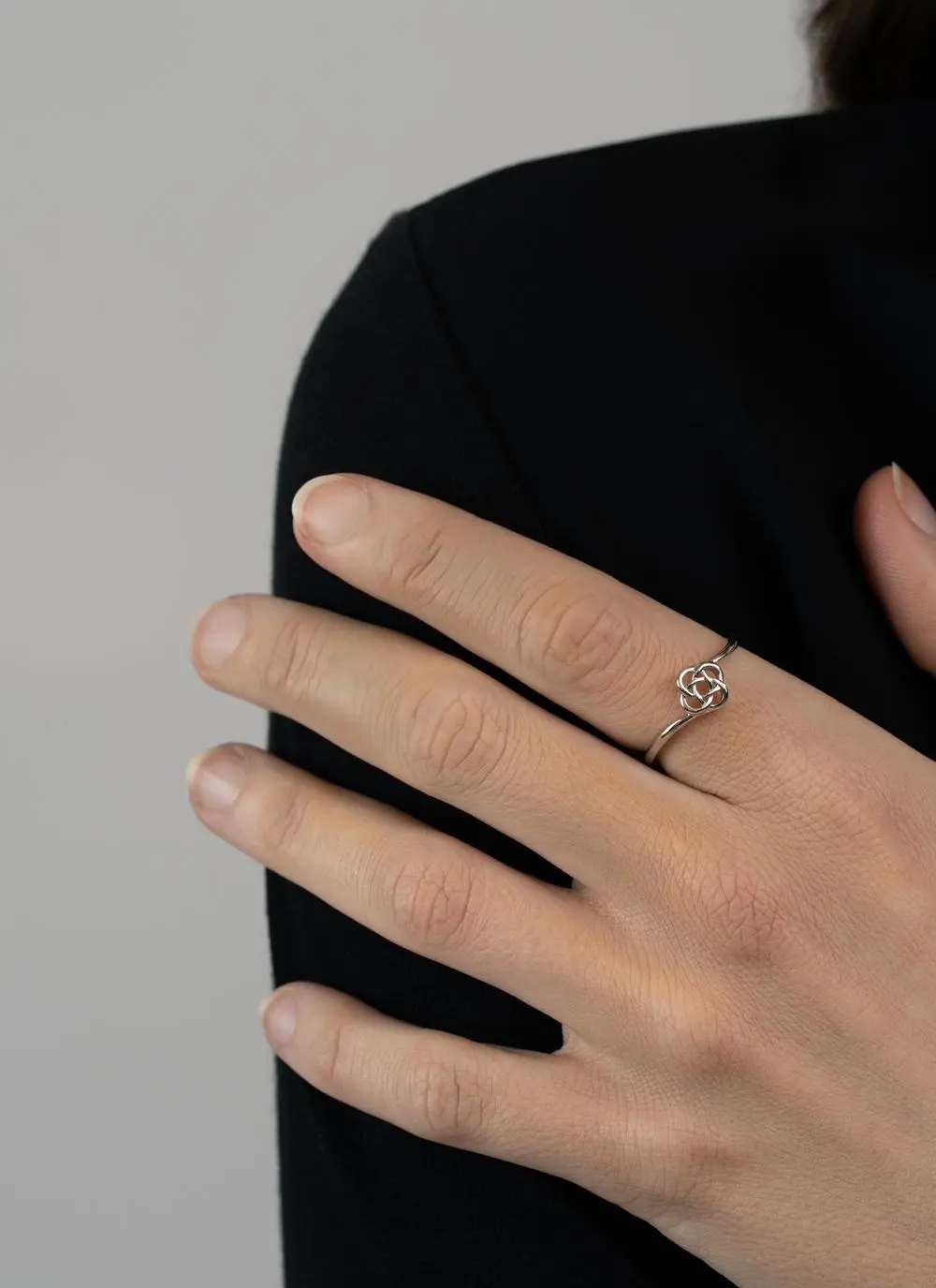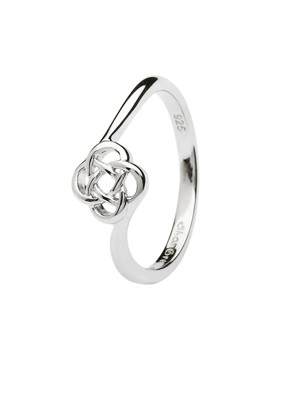 This Celtic knot ring is a simple accessory that is suitable for everyday wear. Created in sterling silver, it has a traditional four corner Celtic knot nestling between the split shanks of a slim silver band. This knot signifies eternity and infinity, along with four directions and the never ending cycle of four seasons.Â