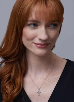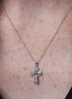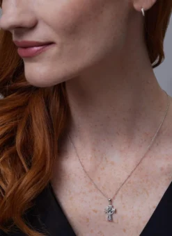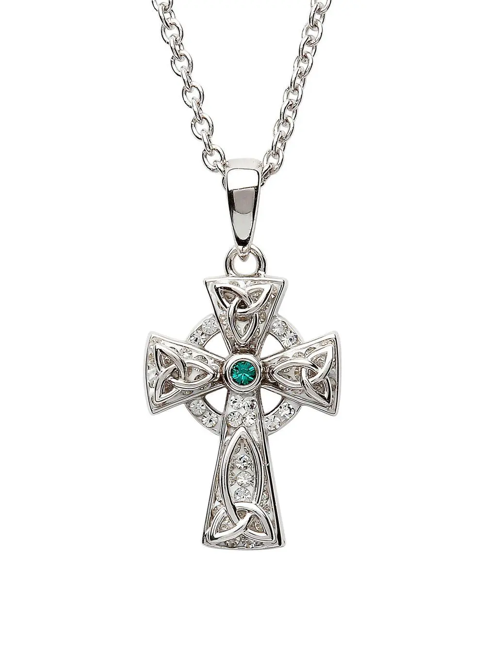 This sterling silver Celtic trinity cross, adorned with white & green Swarovski crystals is a true showstopper. The pendant dazzles with white crystals embellishing the body and the halo, while an emerald-green crystal sits at the center. The arms of the cross feature finely-detailed Trinity knots in sterling silver.Â