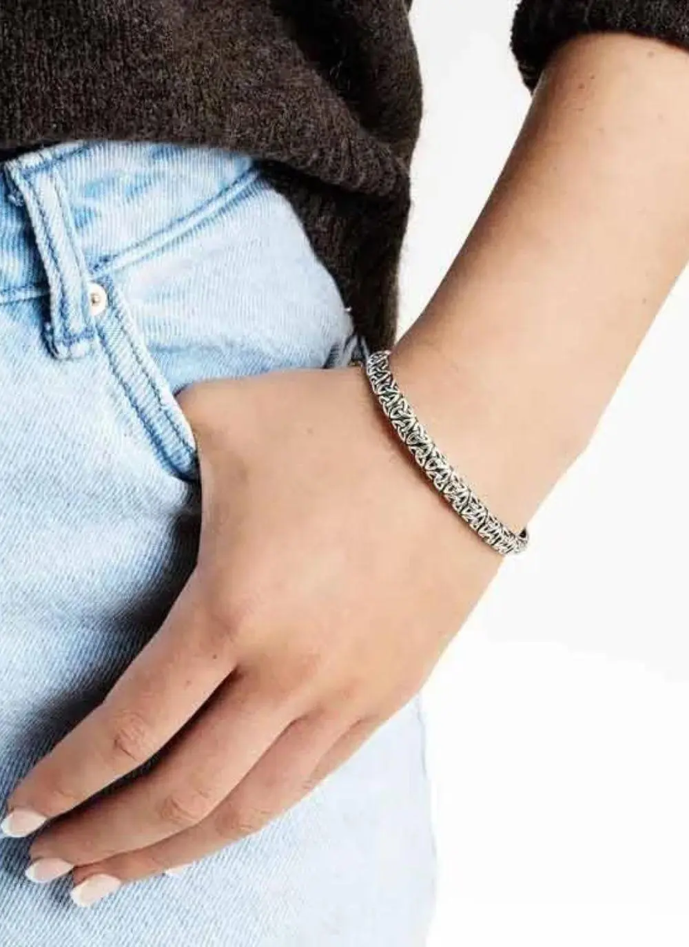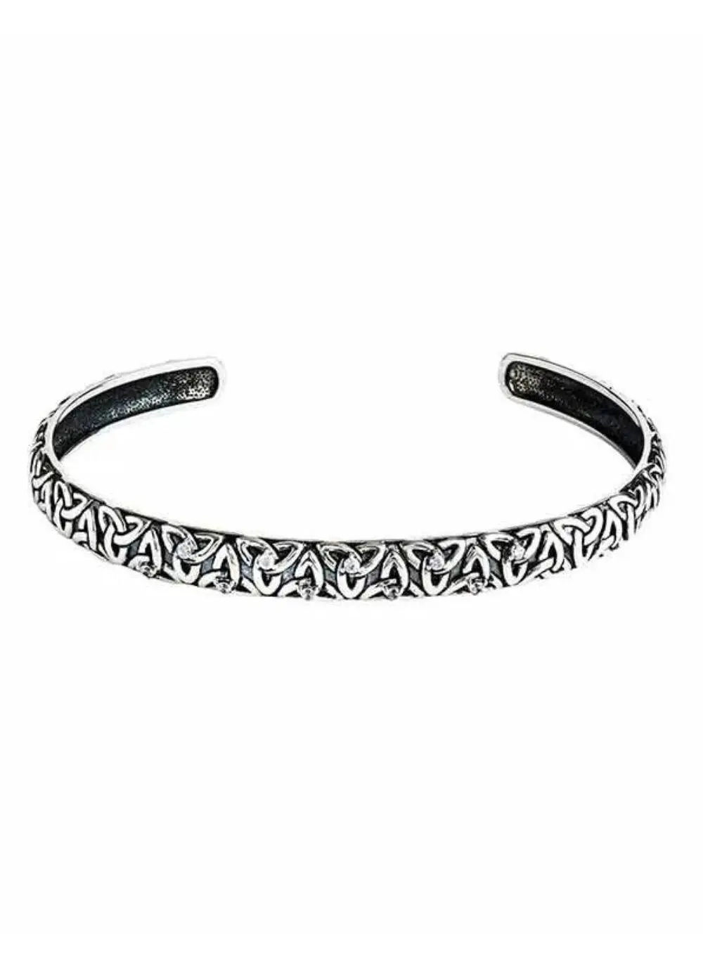This sterling silver bangle features a beautiful Trinity Knot motif, whose intersecting loops are said to symbolize everlasting love. It is set with white cubic zirconia stones for a sparkling finishing touch. Wear on its own or stack with other bracelets for a contemporary look.