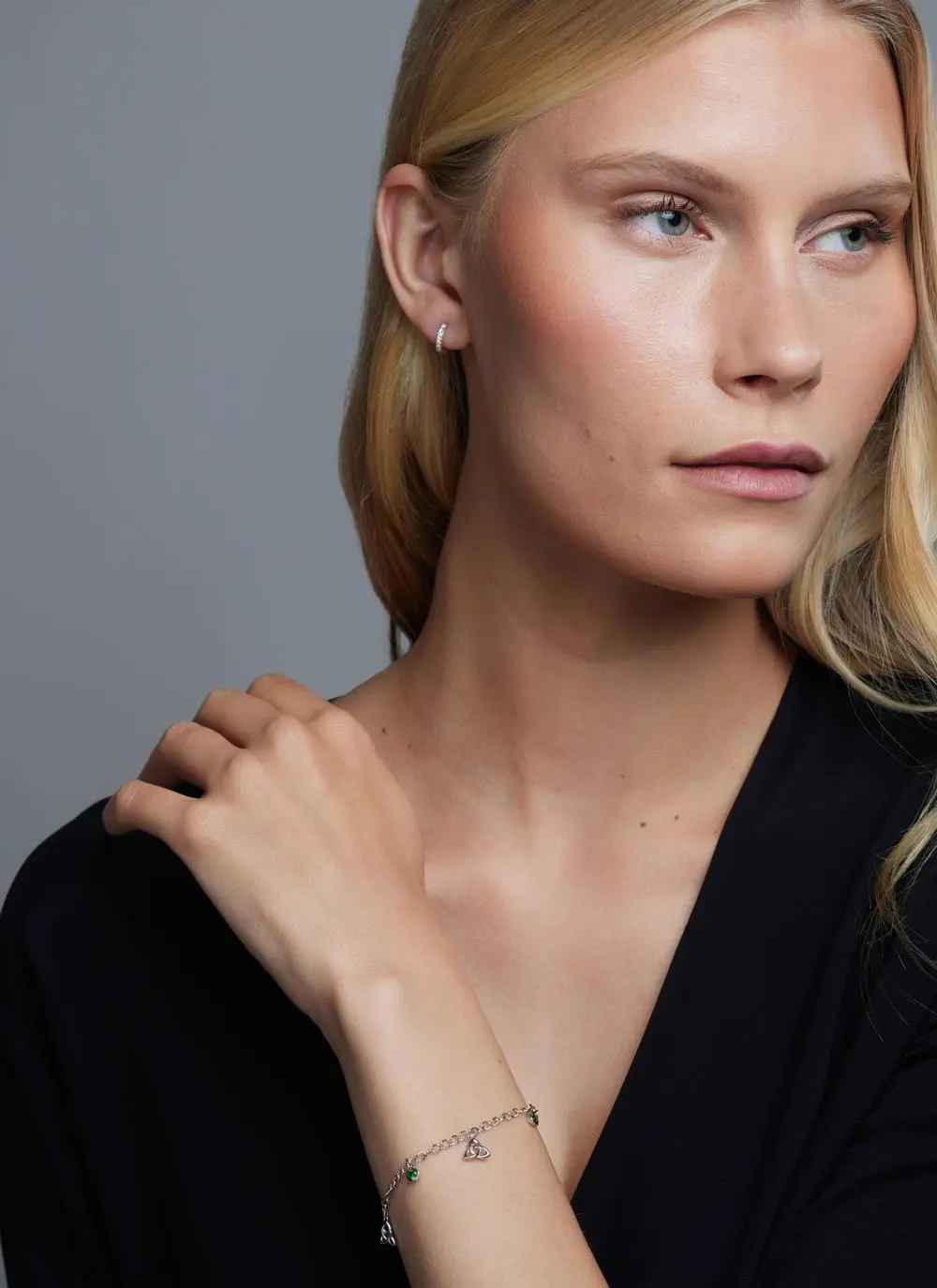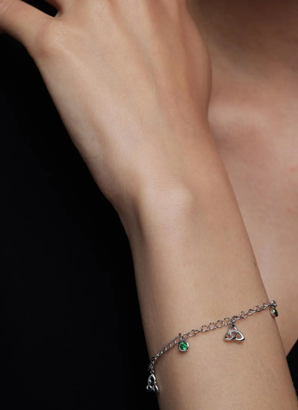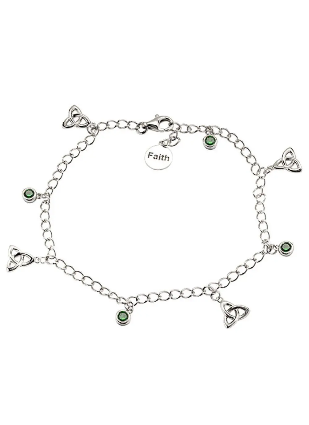 Dainty and delicate, this sterling silver charm bracelet is a beautiful everyday accessory. Embellishing the chain are Celtic Trinity Knots, green cubic zirconias and a single disc with the word “faith” engraved. A special gift for a special someone.