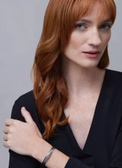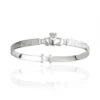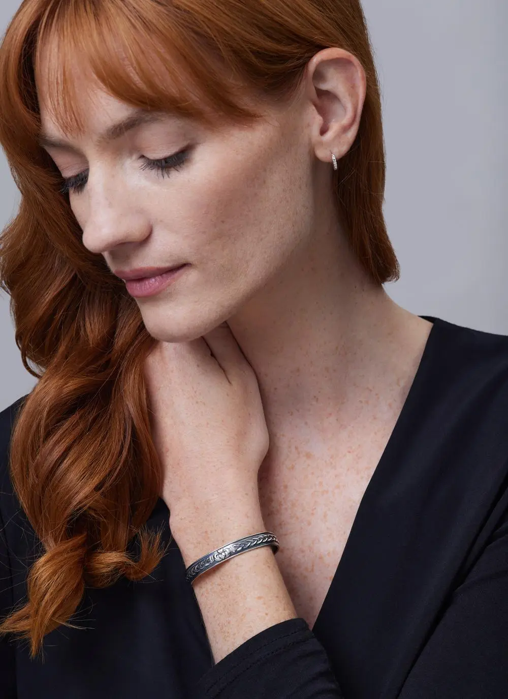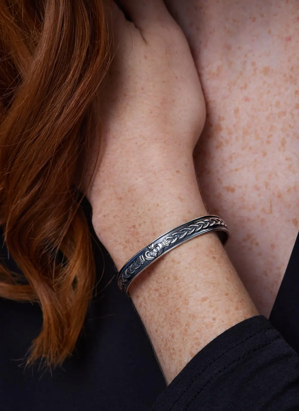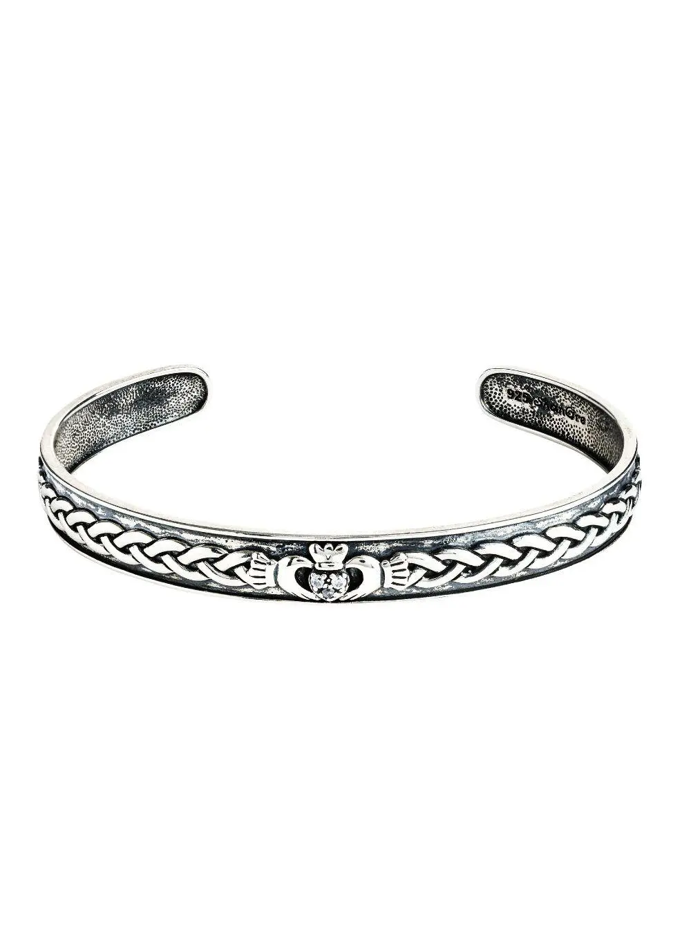 Add a uniquely Celtic finishing touch to your everyday look with this sterling silver bangle. It features an end-to-end knot motif with a Claddagh symbol at its center, whose heart, hands and crown represent love, friendship and loyalty. Set with a cubic zirconia stone for some sparkling contrast.