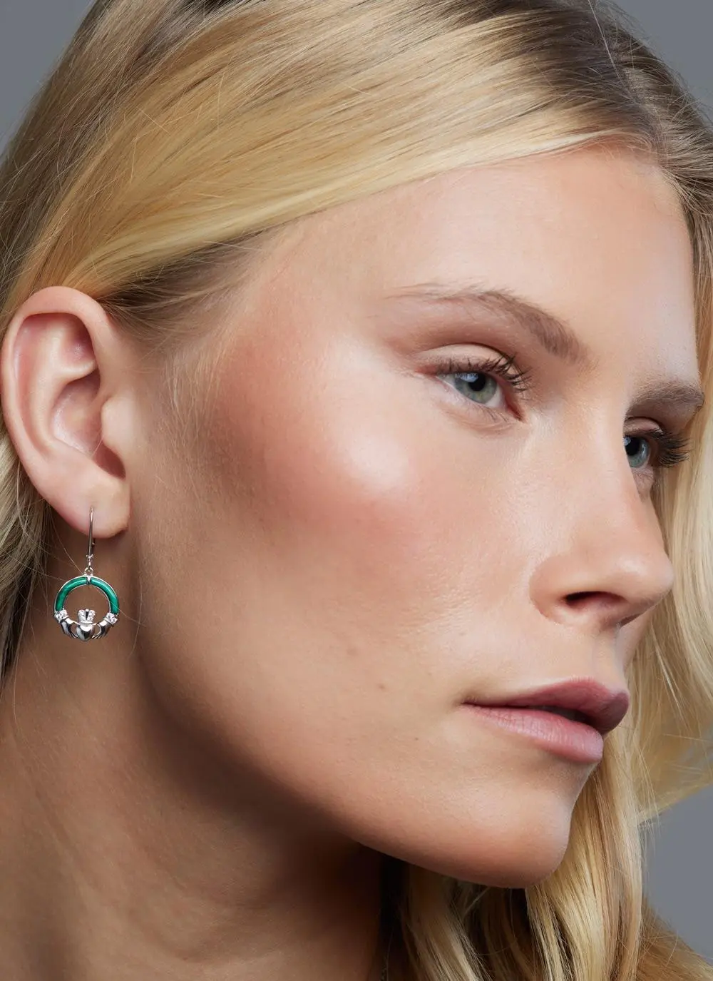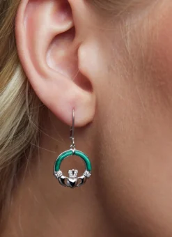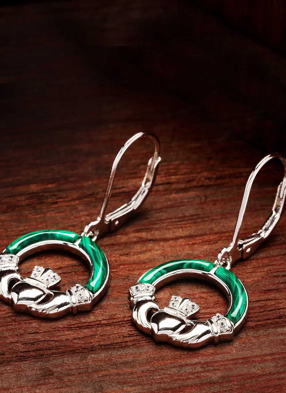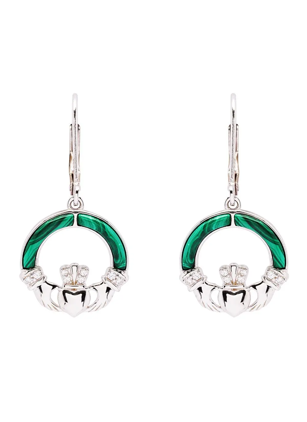 These sparkling earrings contain a silver Claddagh symbol, complimented with white cubic zirconia. The round top is set with malachite, a deep green opaque gemstone. Malachite is said to bring positive transformation. This classic romantic Claddagh design indicates an everlasting sign of love, loyalty and friendship. Matching pendant here.