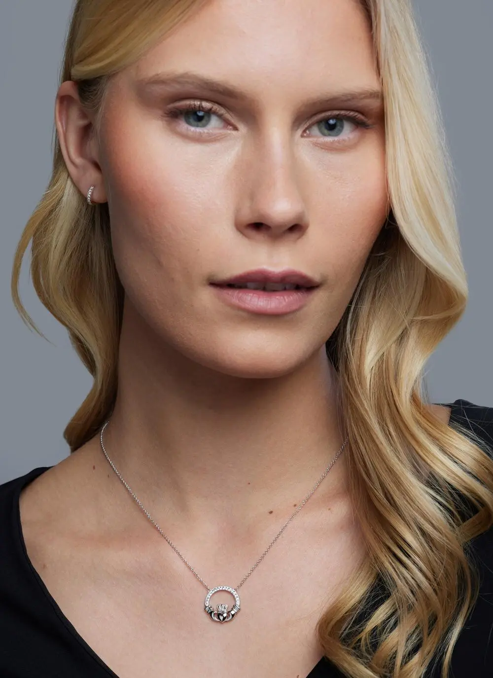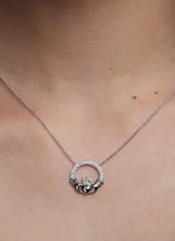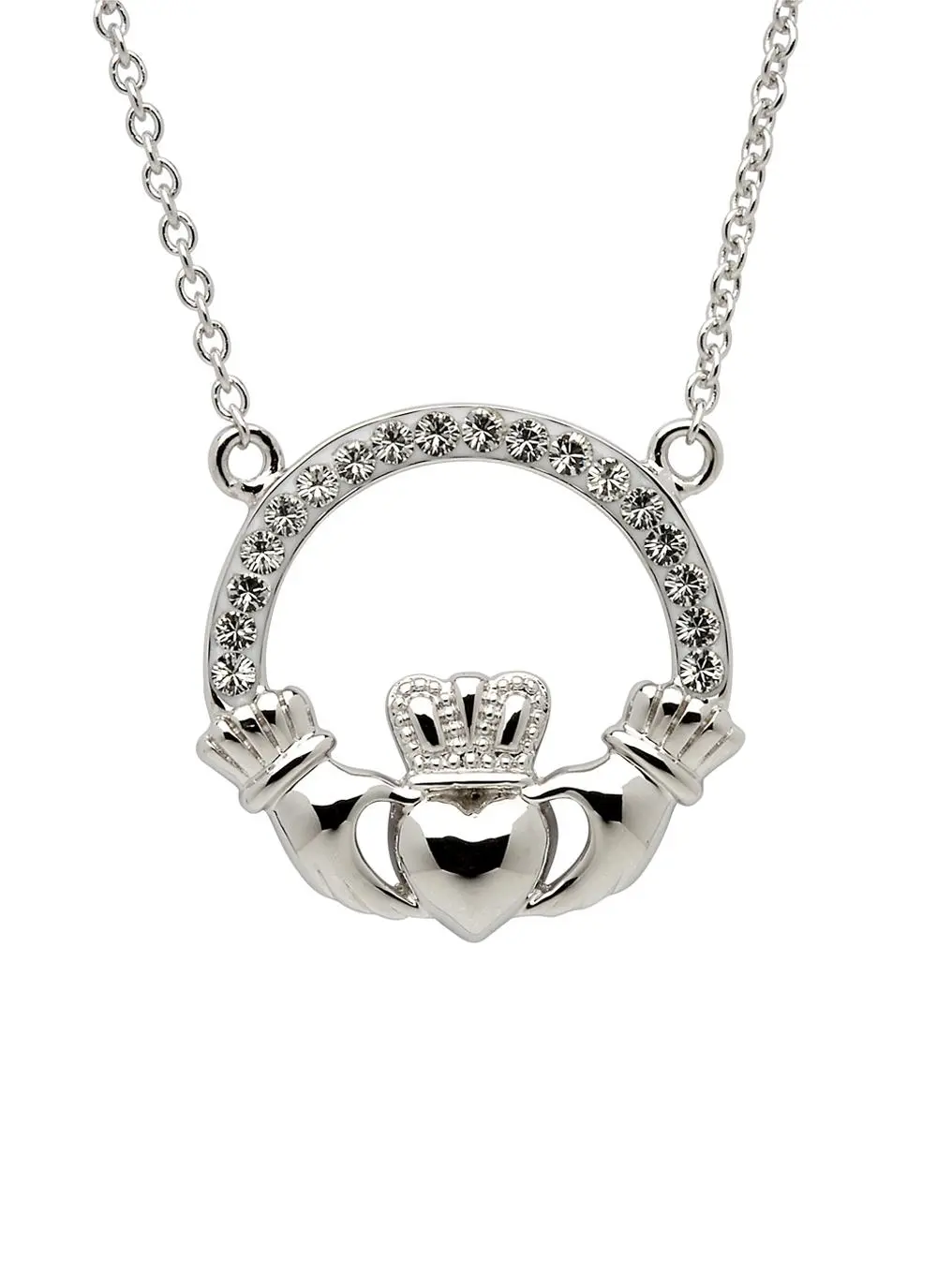 This timeless Claddagh pendant, adorned with Swarovski crystals, is perfect for every day wear. Crafted in Ireland from sterling silver and delicately embellished with Swarovski white crystals, the Claddagh symbolizes love, friendship and loyalty, making this the ideal gift for her!