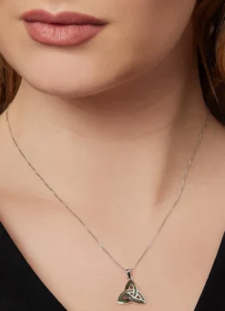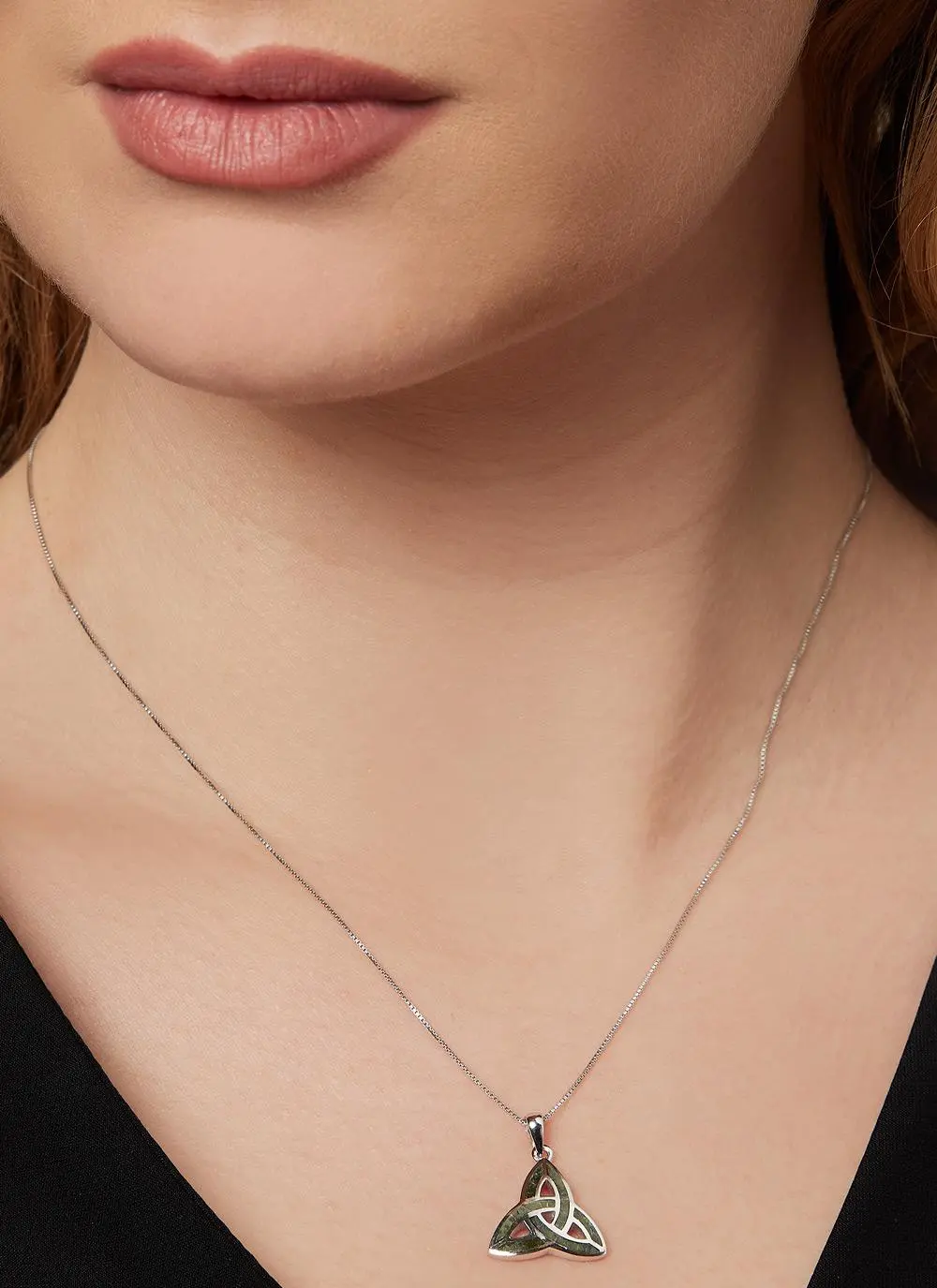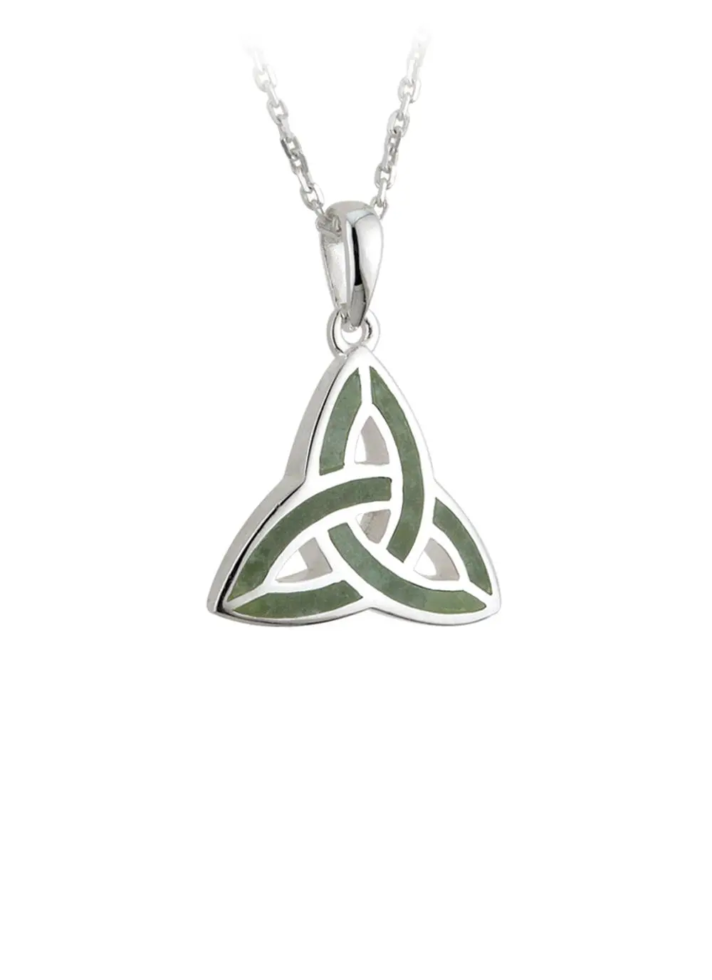 Our trinity knot pendant is delicately crafted from sterling silver and Connemara marble. The iconic trinity knot symbol has three interconnected “leaves” making an eternal form that can’t be untied. Given this elemental form, this design has been adopted by many different groups and cultures through time including the Celtic Irish.