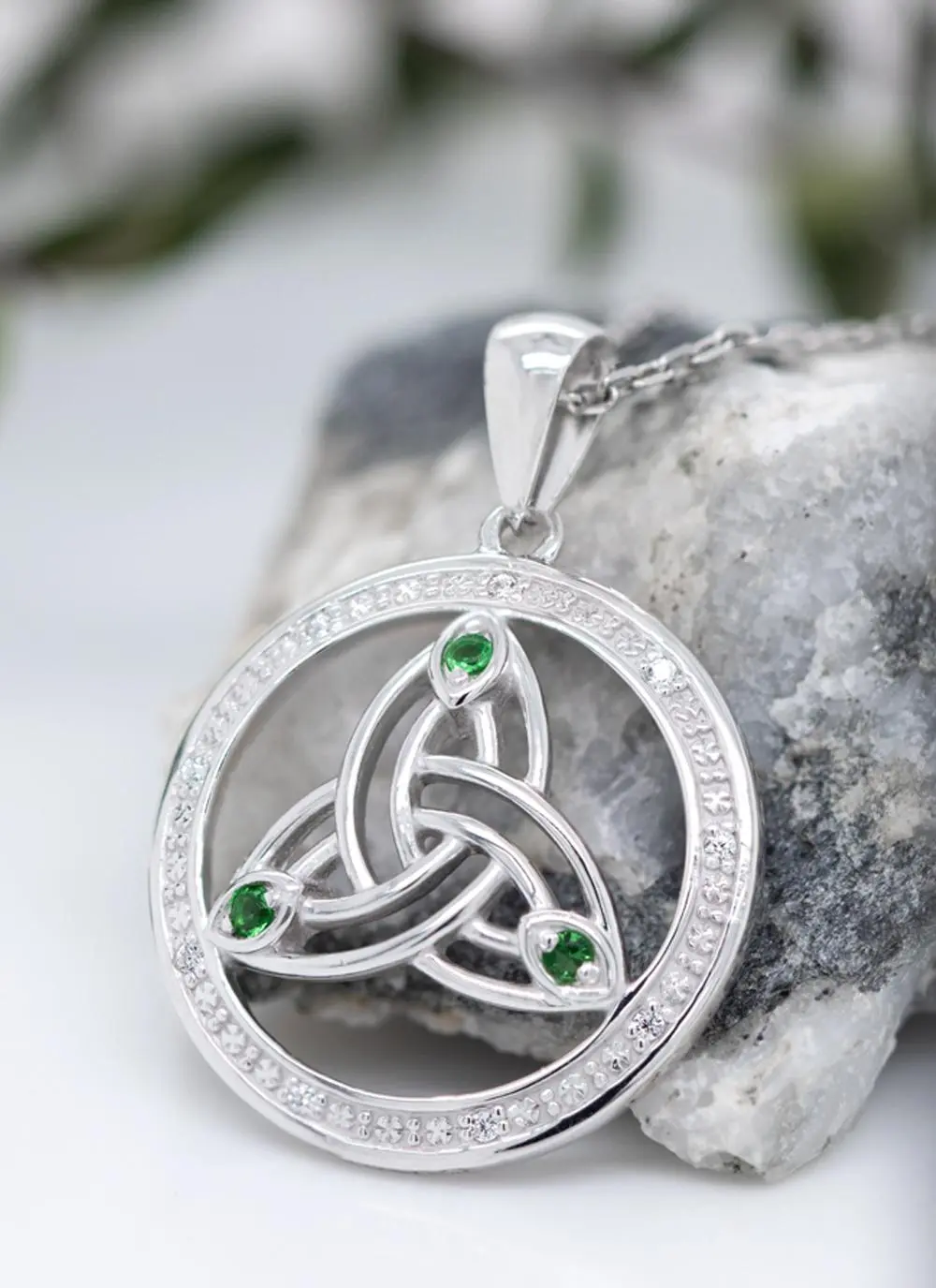 The trinity knot holds a special connotation within Celtic symbology. This iconic symbol has three interconnected “leaves” making an eternal form that can’t be untied. Each point of the trinity knot is encrusted with sparkling green cubic zirconia stones to add a reminder of the Emerald Isle.