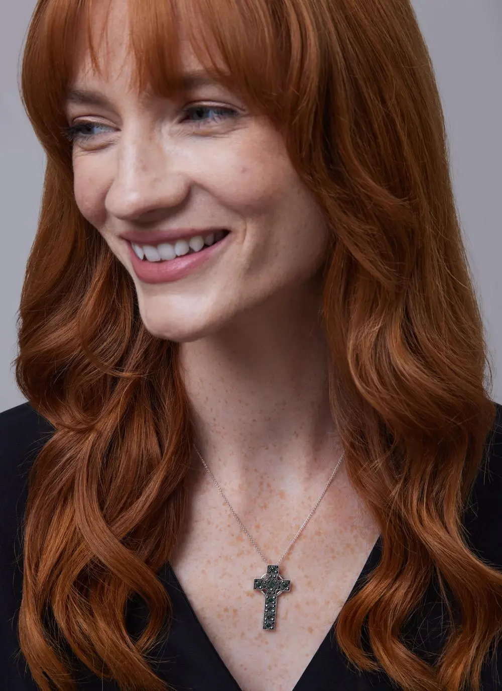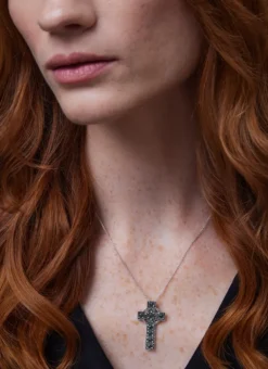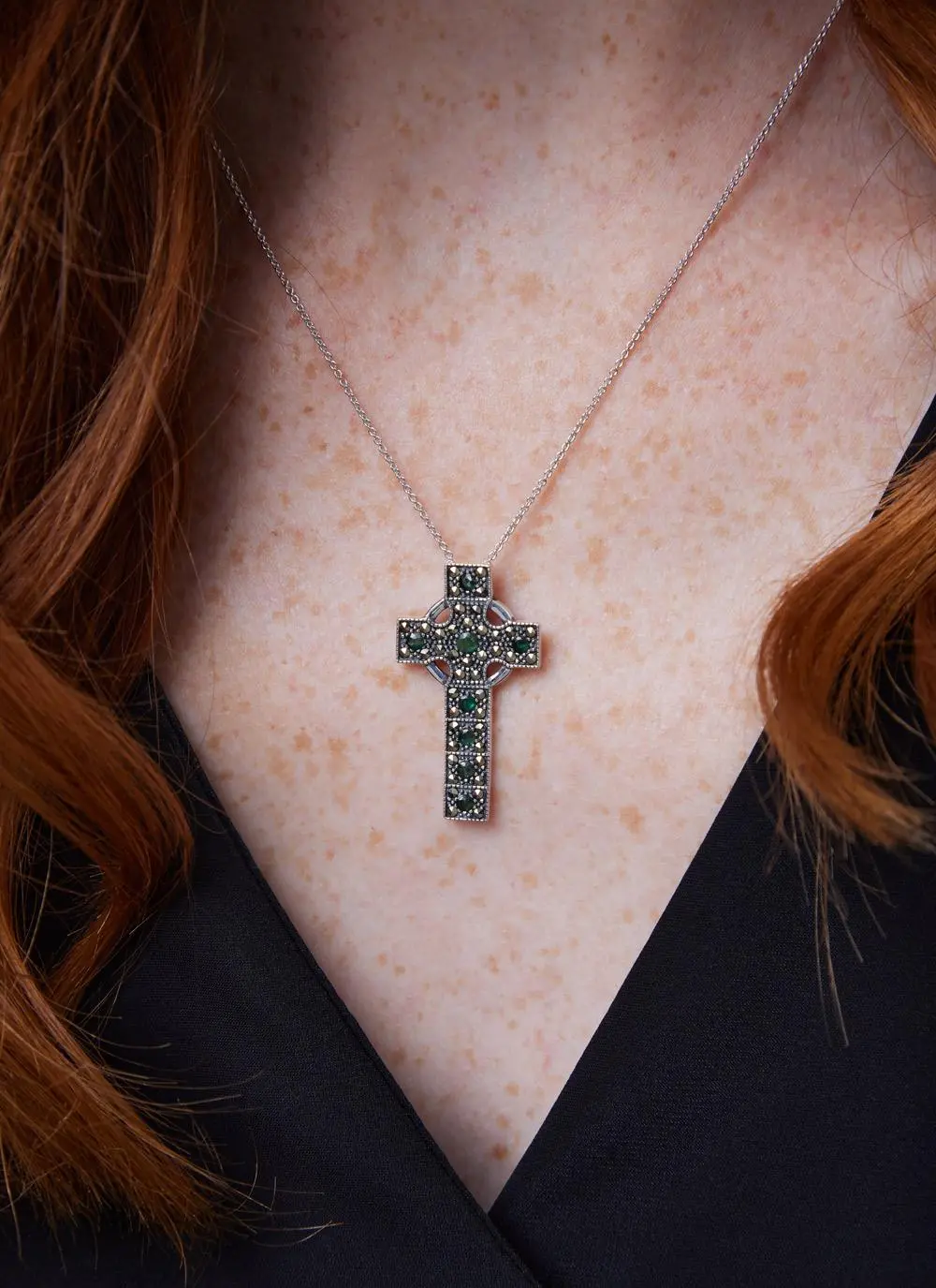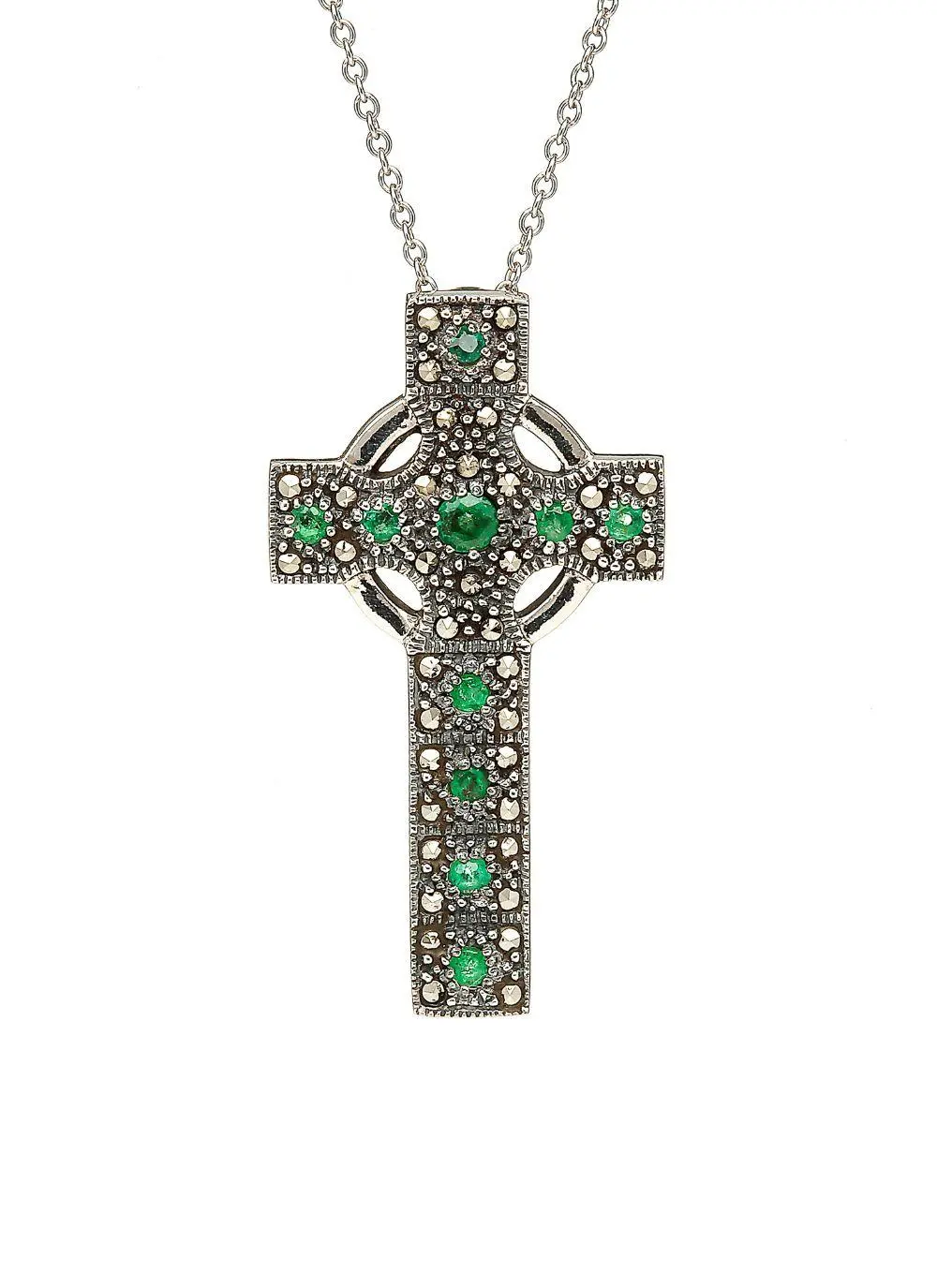 This pendant is unmistakably Celtic. It features a sterling silver Celtic Cross studded with lustrous marcasite and sparkling green cubic zirconia. Hallmarked in Dublin, it makes a beautiful Irish gift for a special someone with Irish roots.