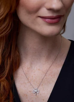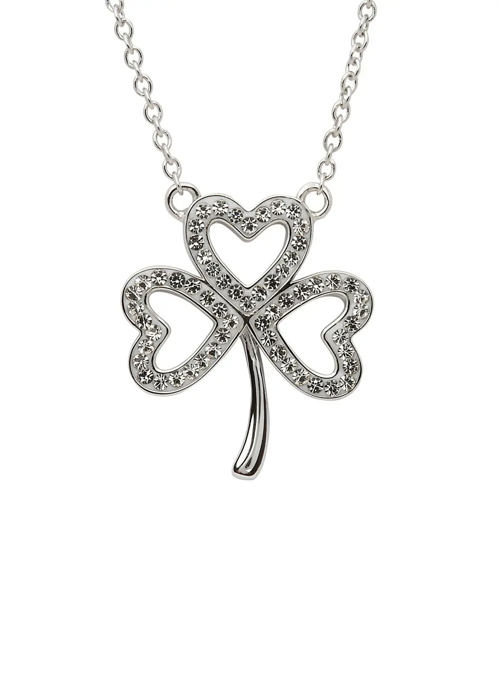 This exquisite open shamrock pendant is made from the finest sterling silver. Each leaf has been beautifully embellished with white Swarovski crystals to add a brilliant sparkle. The Irish shamrock is known to give good luck and good fortune, making this the perfect Irish gift!