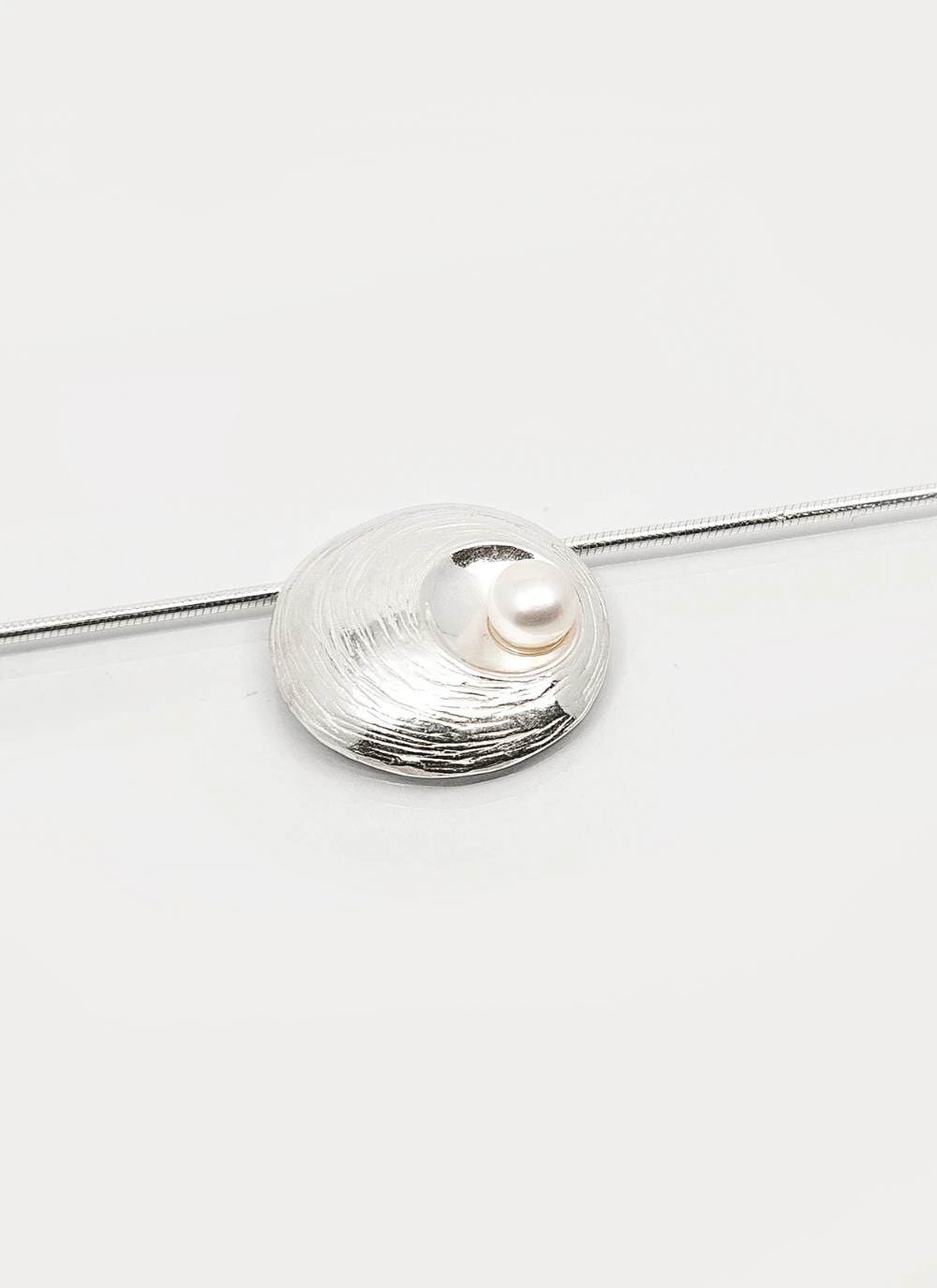 Classic meets contemporary with this beautiful oyster pearl necklace by Irish jewelry designer Martina Hamilton. From a slinky snake chain hangs a medium-sized pendant. A classic, cultured pearl is set in a textured dome of sterling silver with a mirrored, light-reflecting finish. Handcrafted in Ireland.