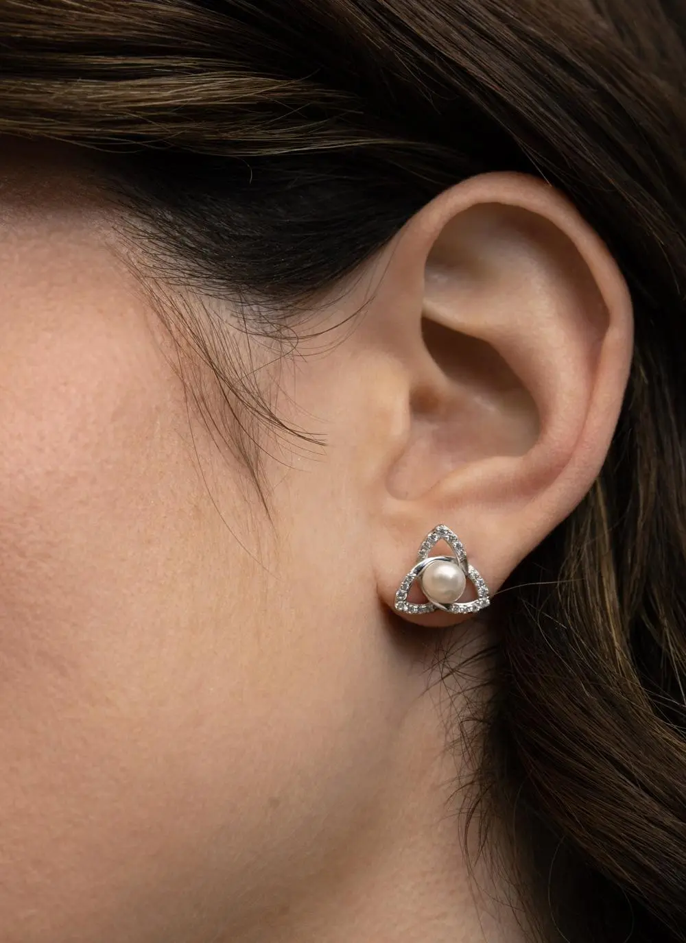 These sterling silver Celtic earrings feature a white pearl set in a cubic zirconia encrusted trinity knot. The trinity knot, also known as the triquetra, is an ancient symbol whose interconnected “leaves” make an eternal form that can’t be untied. Enduringly elegant, these studs make a timeless gift for a special someone with Irish roots.