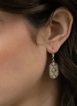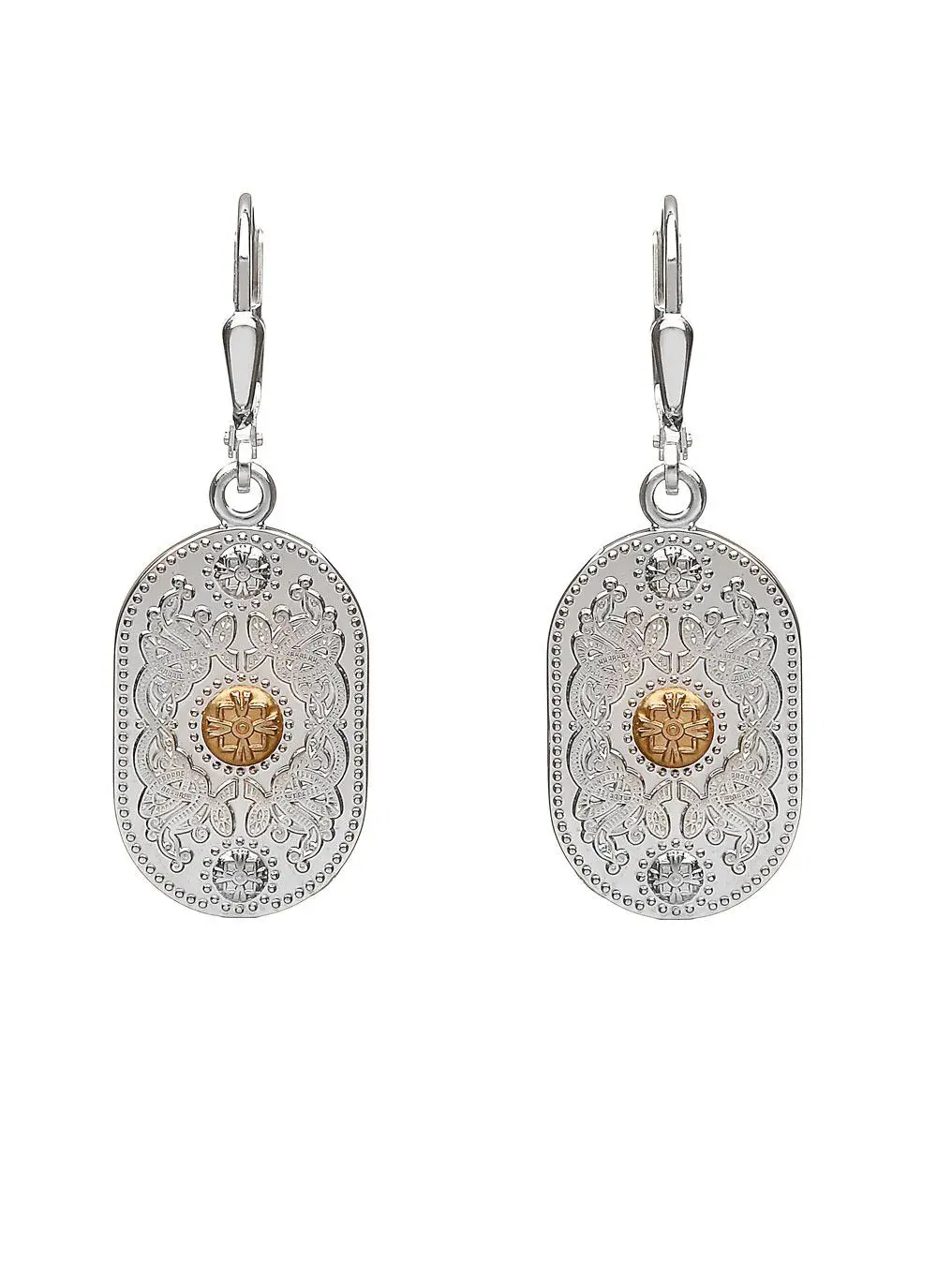 Inspired by the magnificent Ardagh Chalice, these luxurious sterling silver Celtic earrings, are truly unique. Paying homage to Ireland’s rich tapestry of history, culture, art and folklore, these stunning drop earrings feature a 10-carat rare Irish gold boss at their center. They have been handcrafted in Ireland and come gift-boxed.