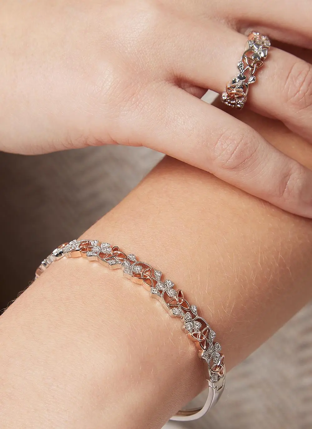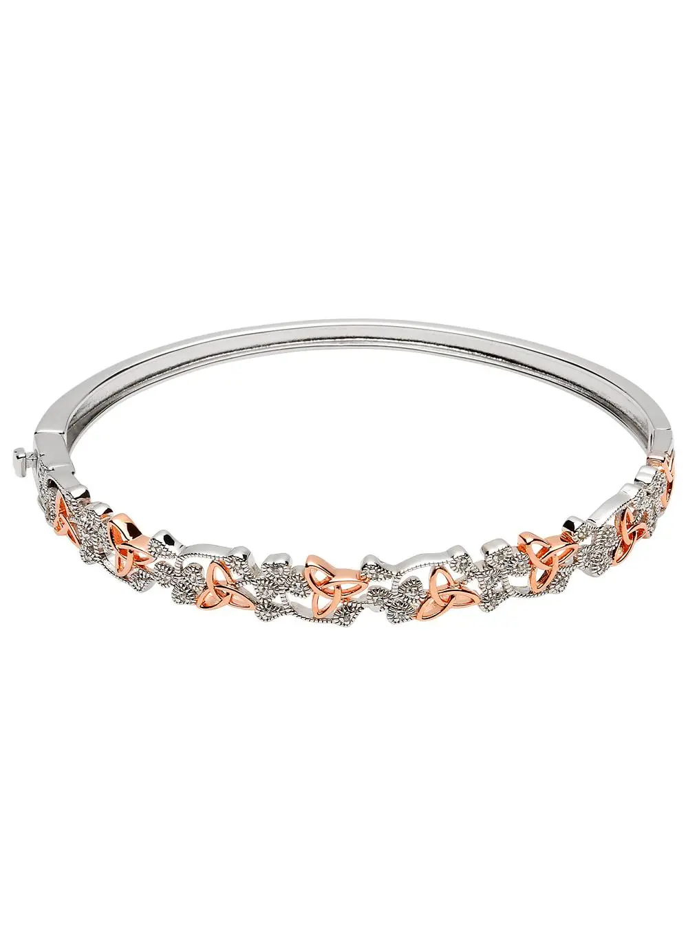 This bangle contains two iconic Irish symbols: the shamrock and the trinity knot. The trinity knot symbol has been plated with rose gold, creating a beautiful contrast of sterling silver and rose gold together. The bracelet also has a closing clasp with and additional clip on either side ensuring complete safety whilst wearing this beautiful piece.