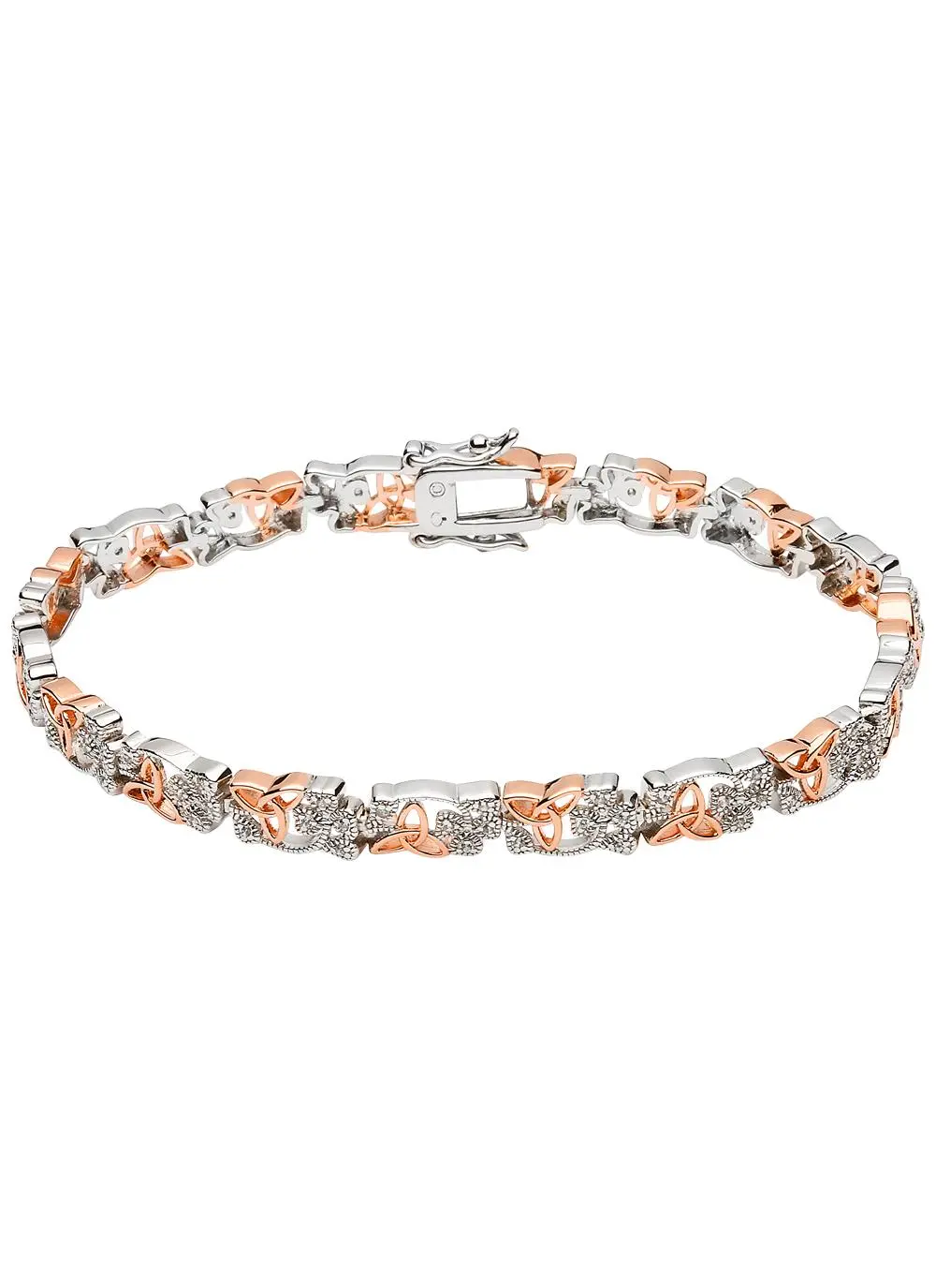 This bracelet contains two iconic Irish symbols: the shamrock and the trinity knot. The trinity knot symbol has been plated with rose gold, creating a beautiful contrast of sterling silver and rose gold together. The bracelet also has a closing clasp with and additional clip on either side ensuring complete safety whilst wearing this beautiful piece.