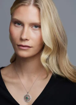 Sparkly yet sophisticated, these sterling silver round pendant will elevate any ensemble. It is set with green and white cubic zirconia stones for a twinkling, eye-catching finish. The intricate Celtic knot motif makes this necklace a beautiful Irish gift for the jewelry lover in your life. Matching earrings here.