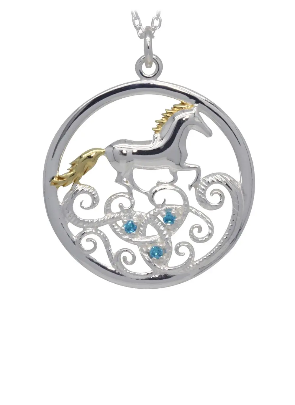 Niamh, from the mythical Irish land of TÃr Na nÓg (Land of Eternal Youth), traveled to the human world to find true love. There, she fell in love with the Irish hero OisÃn. Together they journeyed back to TÃr Na nÓg and emerged into the land of eternal youth. However OisÃn became homesick for Ireland and rode under the waves to his home on a magical horse. This Celtic pendant beautifully brings this legend to life.