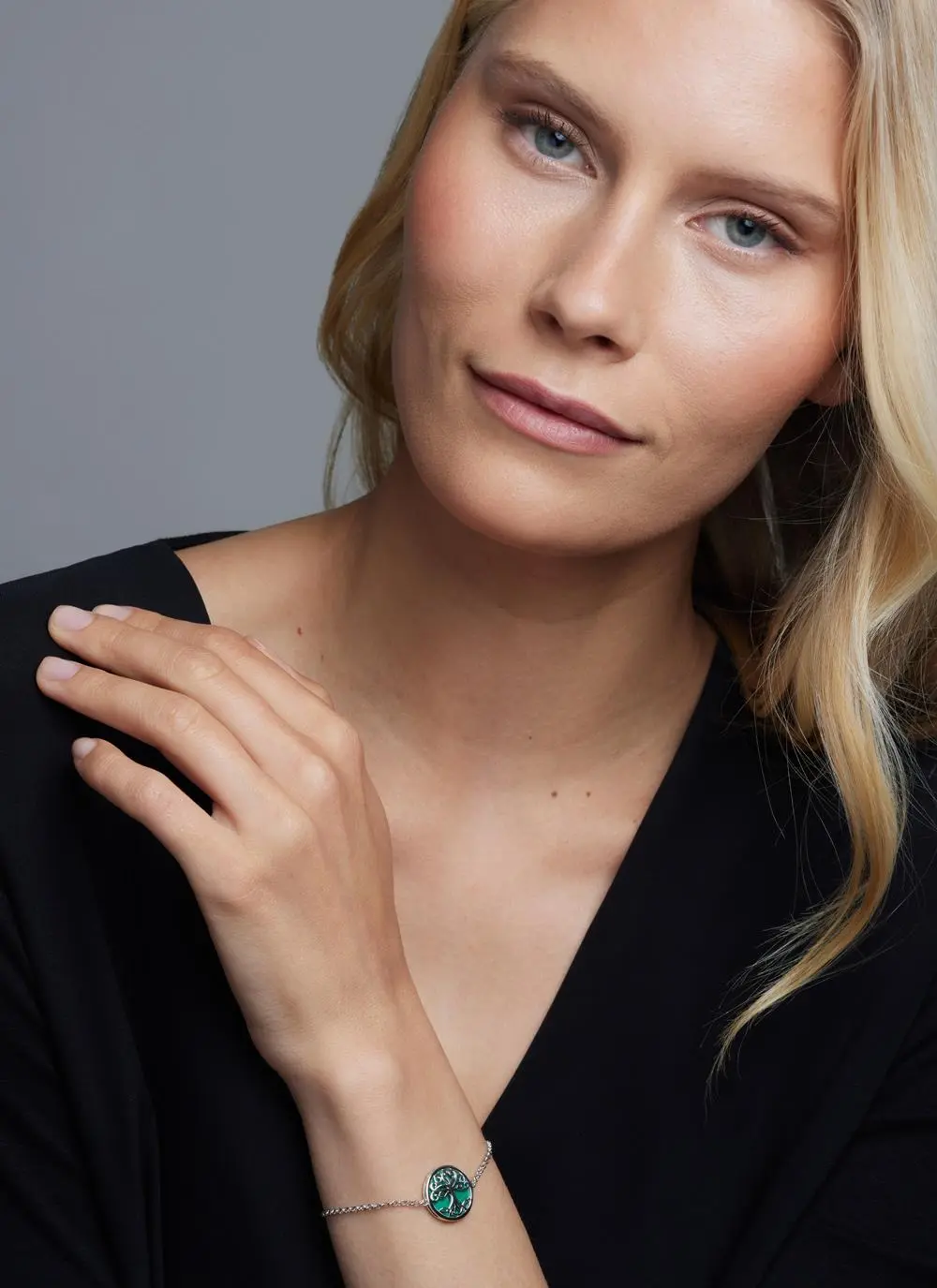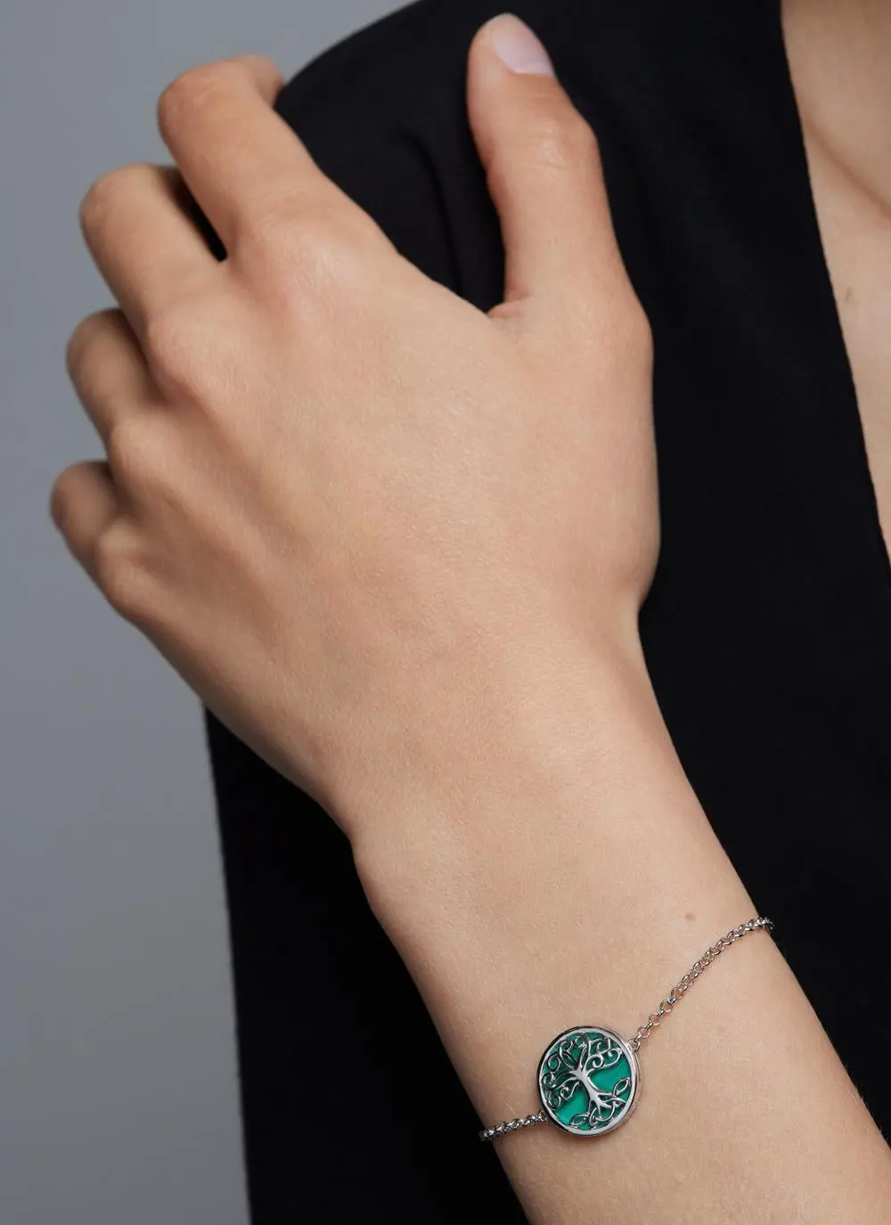 This bracelet features a silver Celtic tree of life with trinity knots on its roots, set against a deep green malachite background. The malachite is believed to bring positive transformation, while the tree of life symbolizes strong roots, lineage, and hope, and the trinity knots represent the eternal cycle of life, death, and rebirth. The overall design of the bracelet is meant to convey strong family bonds and good luck.
