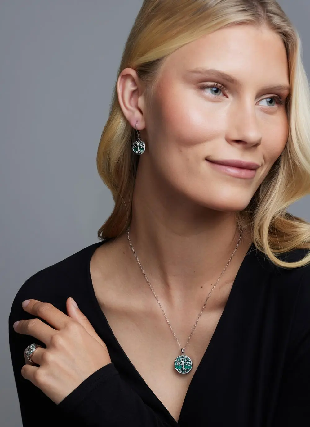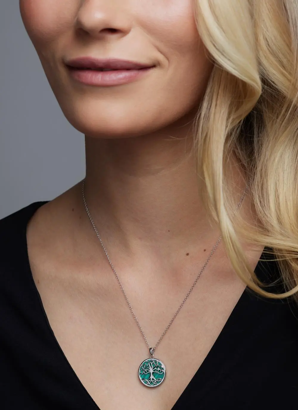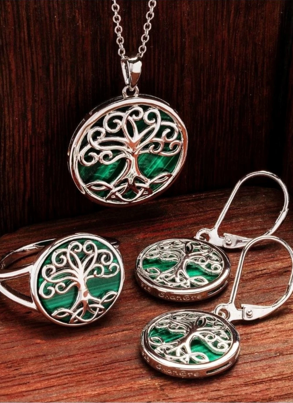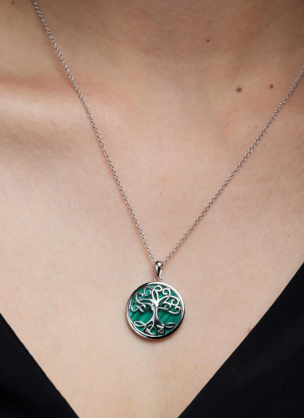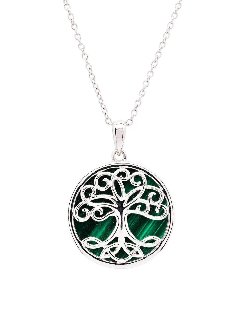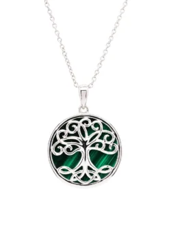 This pendant features a silver Celtic tree of life with trinity knots on its roots, set against a deep green malachite background. The malachite is believed to bring positive transformation, while the tree of life symbolizes strong roots, lineage, and hope, and the trinity knots represent the eternal cycle of life, death, and rebirth. The overall design of the pendant is meant to convey strong family bonds and good luck.Â