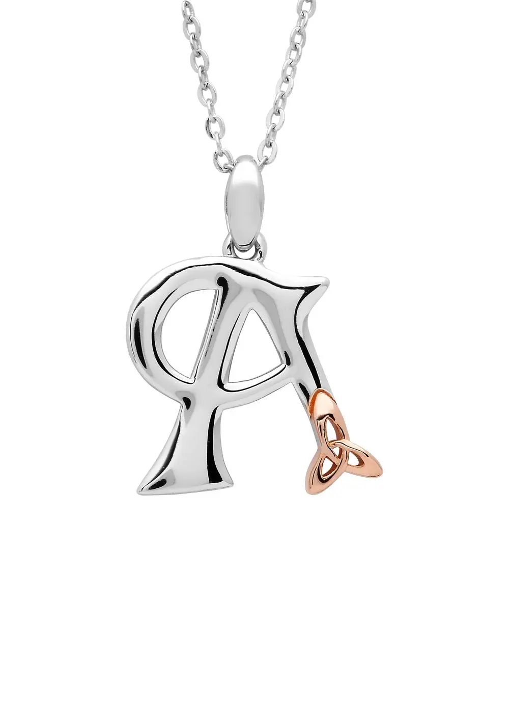 Show the world the initial that means the most to you; is it your own, or the one you love? This sterling silver necklace features a single initial beautifully designed with a rose gold plated trinity knot. The perfect meaningful gift for you or someone special.